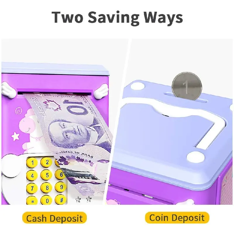 This money saver has coin and cash slots.Cash is automatically rolled-in and music will play when cash are inserted into the cash slot, which creates more joys for to deposit money.