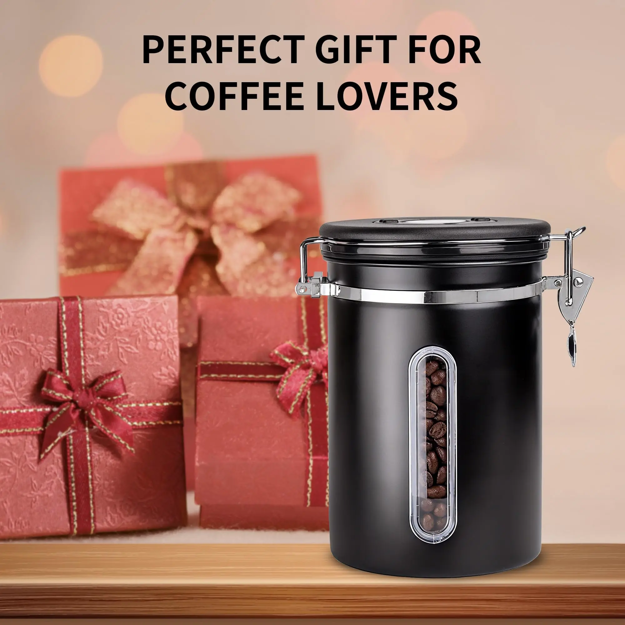 This 22OZ coffee canister is ideal for storing ground coffee, beans, cereal, sugar, rice, tea, and flour. It features a window for easy viewing, a scoop for convenient serving, and an airtight lid to keep contents fresh. The stainless steel construction ensures durability and hygiene. Perfect for your kitchen's coffee bar accessories.