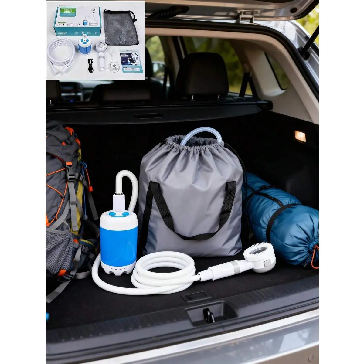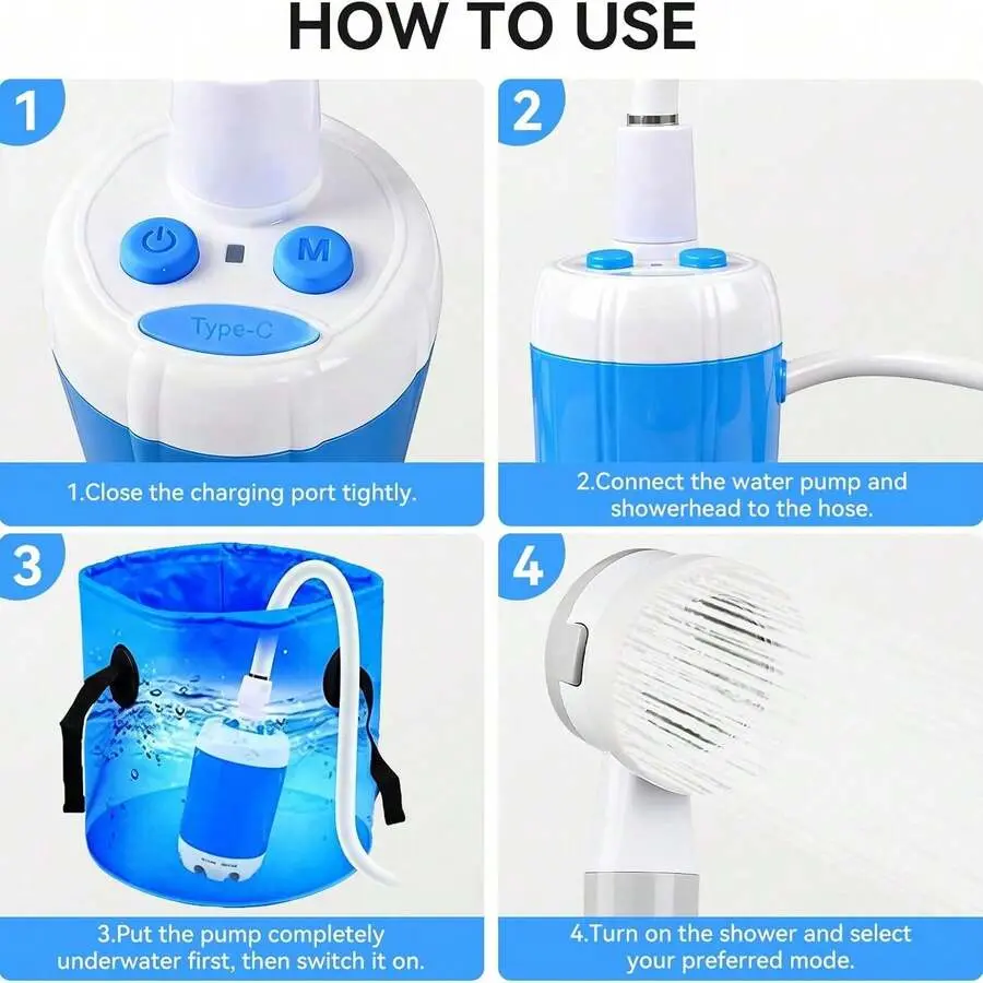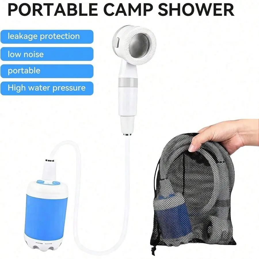 [Compact and portable design]Weighing only 1.5 pounds, it comes with a mesh storage bag for easy transportation in backpacks or car trunks.Built in 4000mAh large capacity battery, with a charging time of 3-4 hours hours and a running time of 1-2 hours, it is very suitable for 2-3 people to shower.The ideal choice for camping, traveling, and beach outings