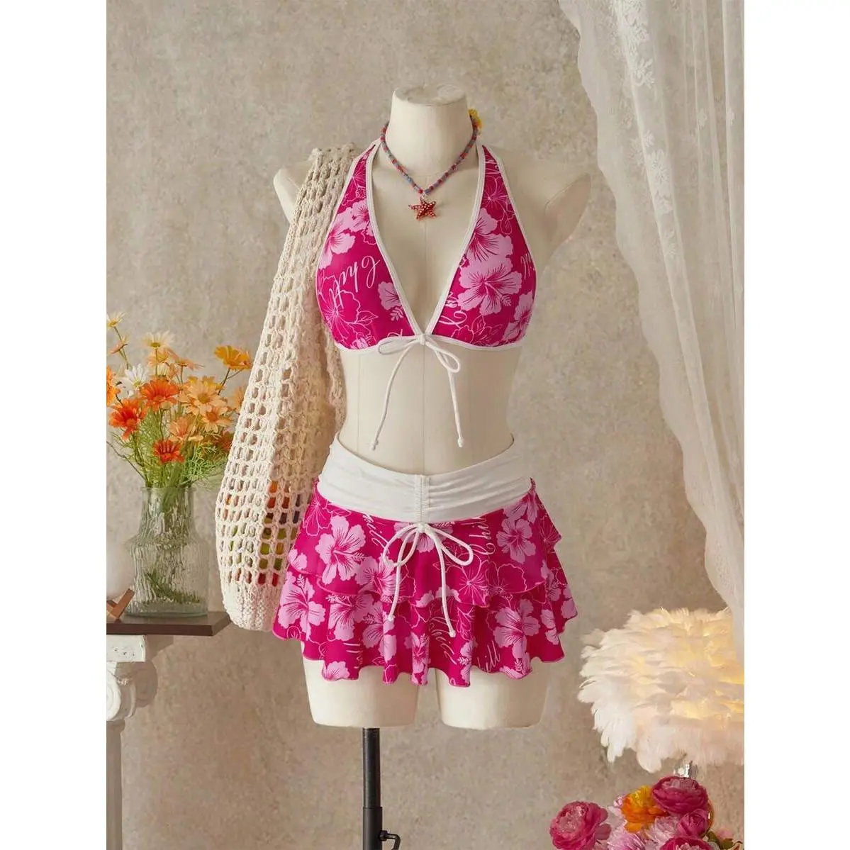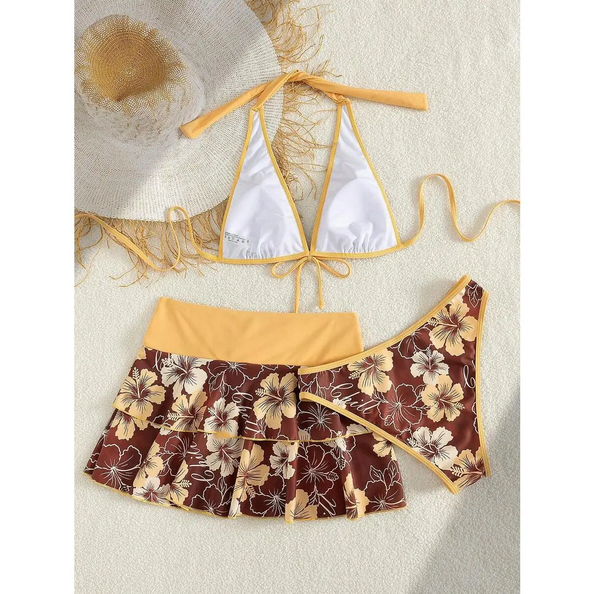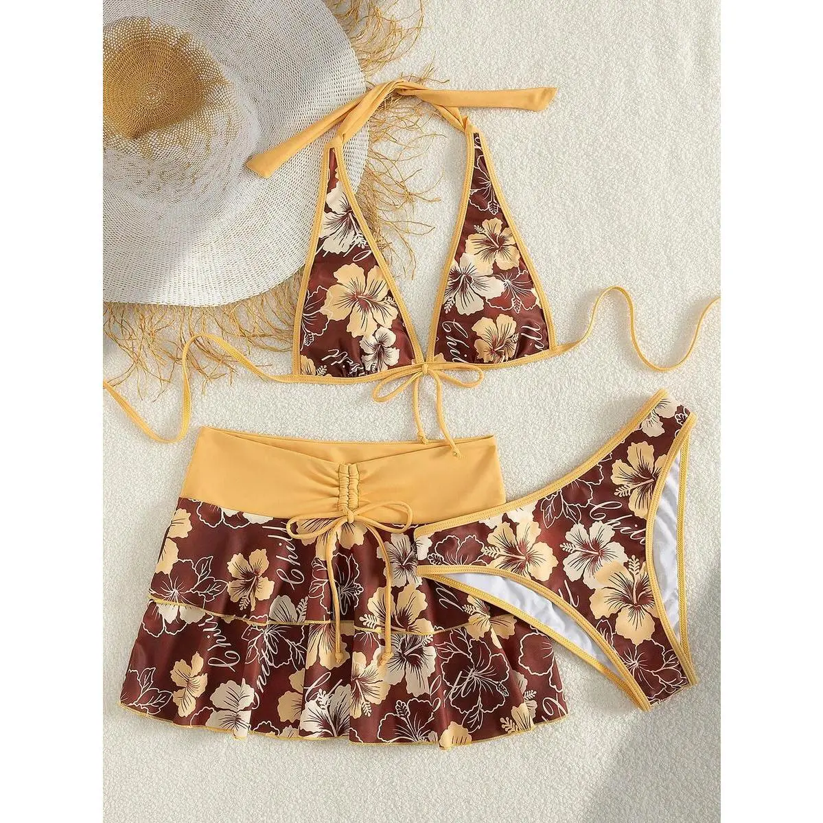 Women's Summer Beach Music Festival Flower Pattern Skirt Halter Casual Vacation Style Bikini 3 Pieces Set