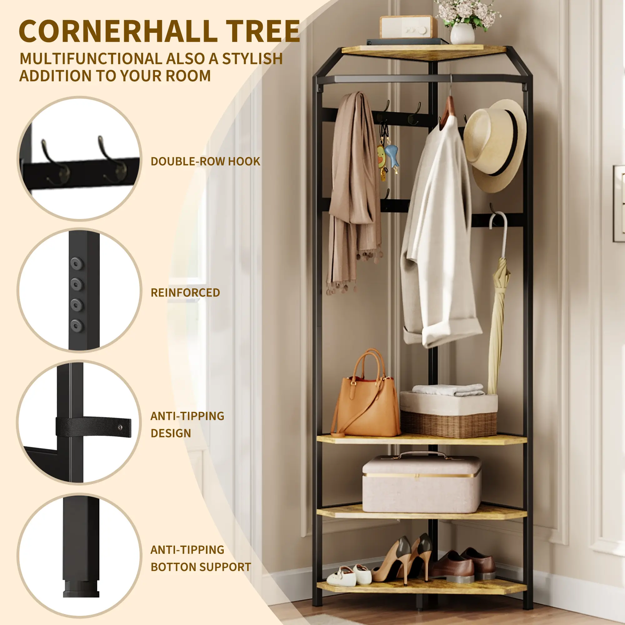 ·Modern & Durable: Crafted with a modern aesthetic, available in Ash Grey, Vintage, or Gold finishes, this coat rack blends seamlessly with your décor. The waterproof surface and reinforced construction ensure durability and easy maintenance, while the anti-tipping kit delivers added stability—perfect for households with children or pets.