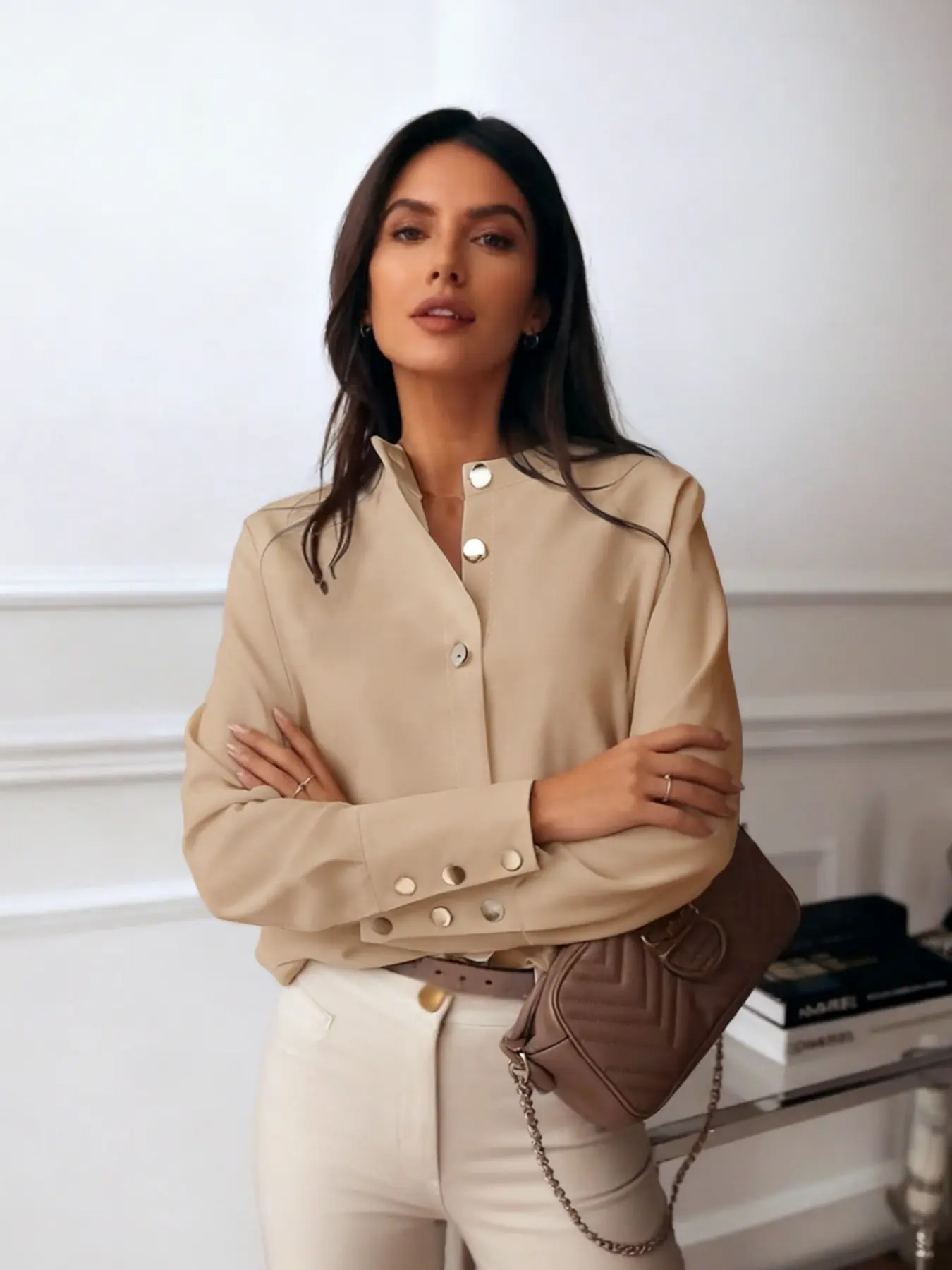5. Women's solid color fashionable casual button-down shirt, suitable for spring and summer, suitable for home, indoor, and outdoor wear