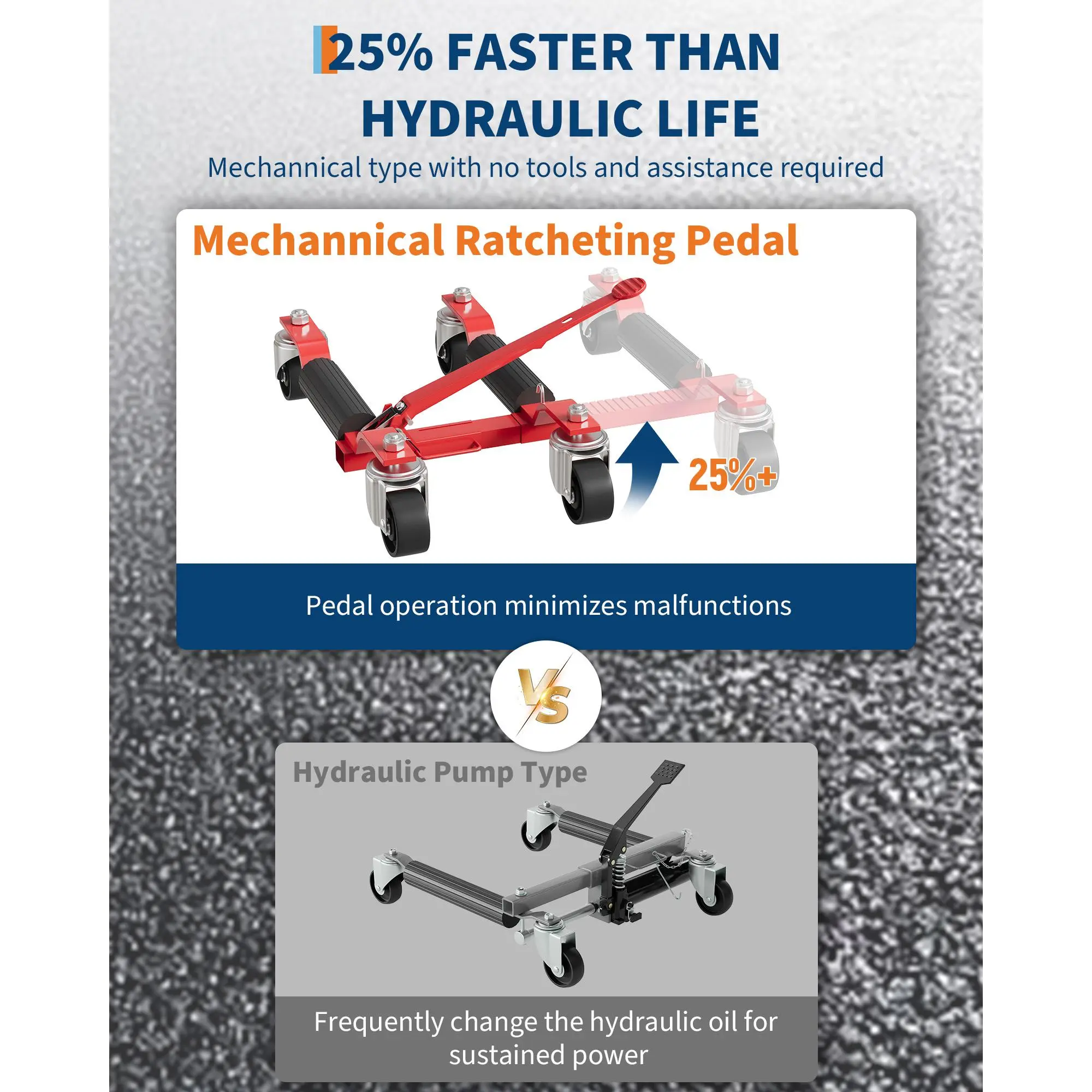 ·Advanced Ratcheting Foot Pedal: The innovative foot-operated ratchet system allows for fast, hands-free lifting and wheel positioning—up to 30% faster and 40% less effort than standard hydraulic models. The ergonomic, non-slip handle ensures comfortable and safe operation.