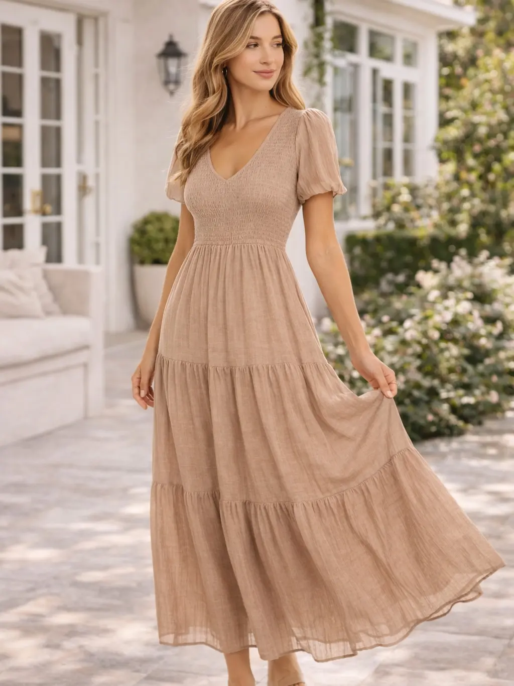 Soft, feminine, and effortlessly wearable, this taupe maxi dress brings a relaxed elevated feel to everyday dressing. Designed with a flattering V-neckline, smocked bodice, short puff sleeves, and a flowing tiered skirt, it creates beautiful movement while keeping the silhouette easy, comfortable, and polished.