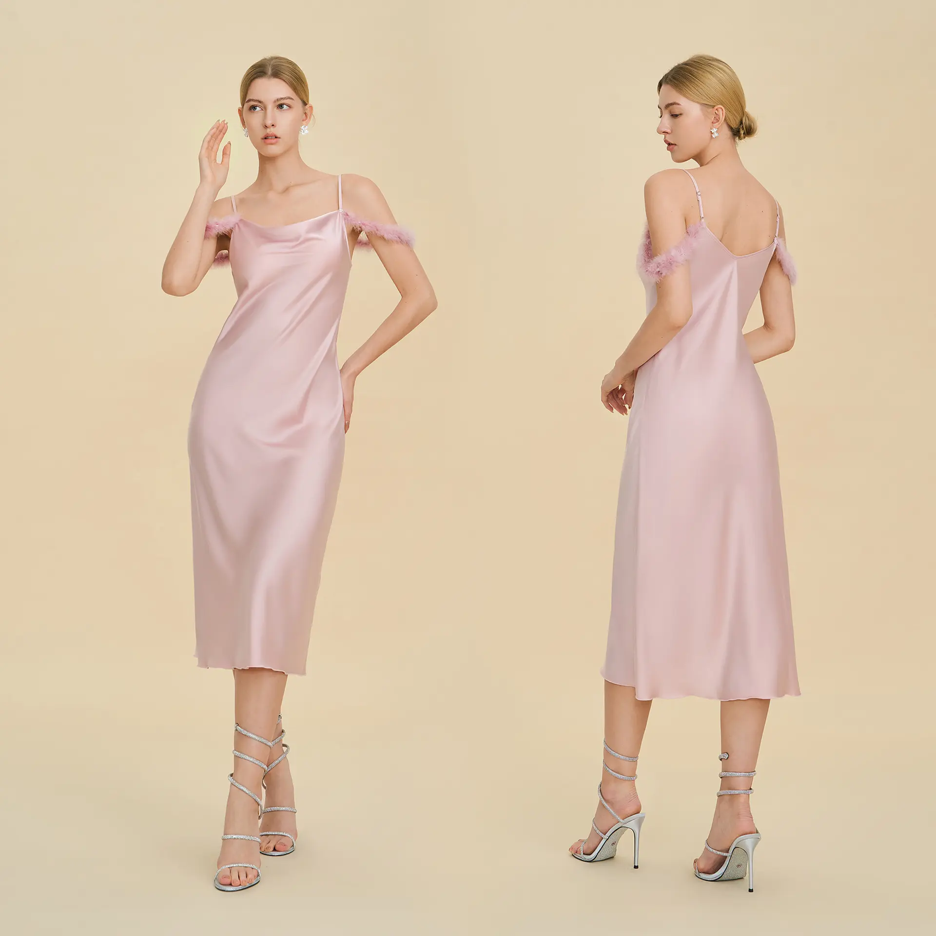 French-style light luxury satin feather strap dress, crafted from high-quality satin fabric, offers a silky smooth touch and excellent drape, with a natural glossy sheen. The feather embellishment on the shoulders adds a lively and elegant touch, enhancing the sexy atmosphere. The square-neck strap design highlights the charming lines of the shoulders and neck, offering both elegance and sexiness. The slim-fit, body-hugging cut accentuates the figure, creating a slender hourglass silhouette. The mid-length design is elegant and sophisticated. The classic color is versatile and slimming, suitable for dinner parties, dates, parties, and other formal occasions, making it a sexy goddess piece that enhances your charm