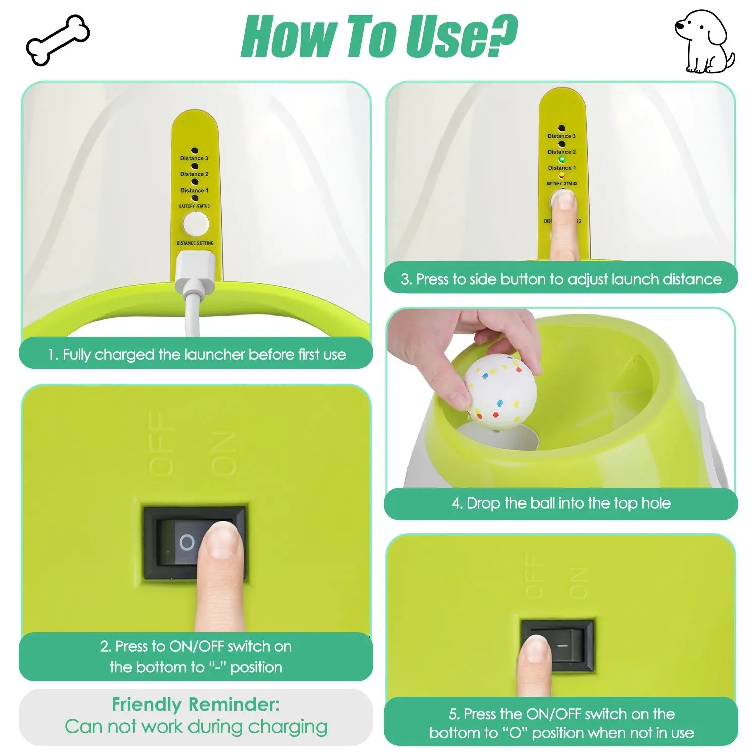 Safe & Easy To Use: Prioritizing safety, this launcher boasts a stable base equipped with 4 anti-slip silicone pads to prevent tipping. Effortlessly operate the device by turning it on and selecting the preferred distance. LED indicators provide clear, intuitive feedback on battery status and distance settings, making it user-friendly for every pet owner.
