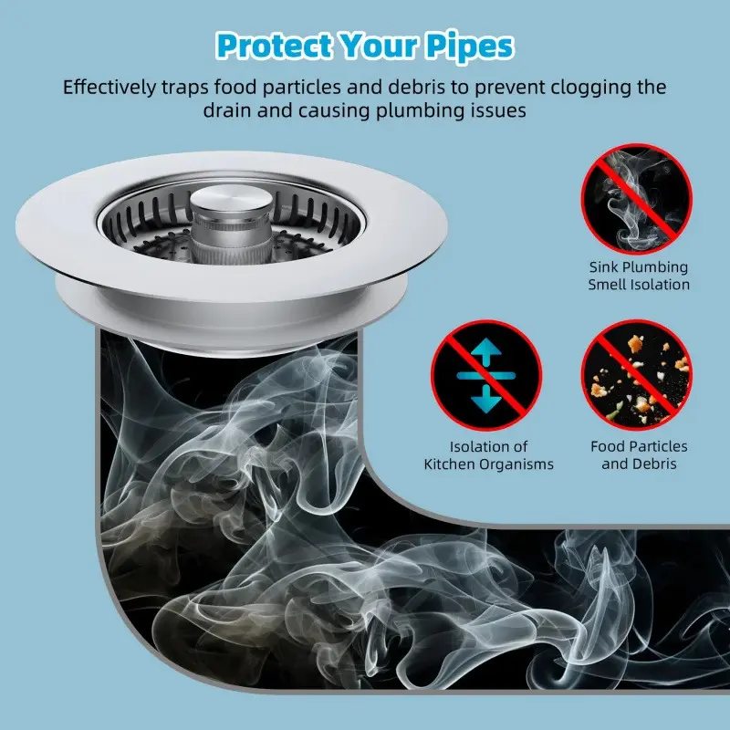 【Invovative 3-in-1 Functionality】The sink strainer is a versatile 3-in-1 tool that doubles as a water reservoir, a strainer, and an smell barrier. With its multi-layer sealing gaskets, it not only prevents leaks but also encapsulates smell from the kitchen drain. Whether you're washing dishes, filling the sink, or keeping food debris from clogging the drain, this innovative accessory offers comprehensive functionality for all your kitchen needs.