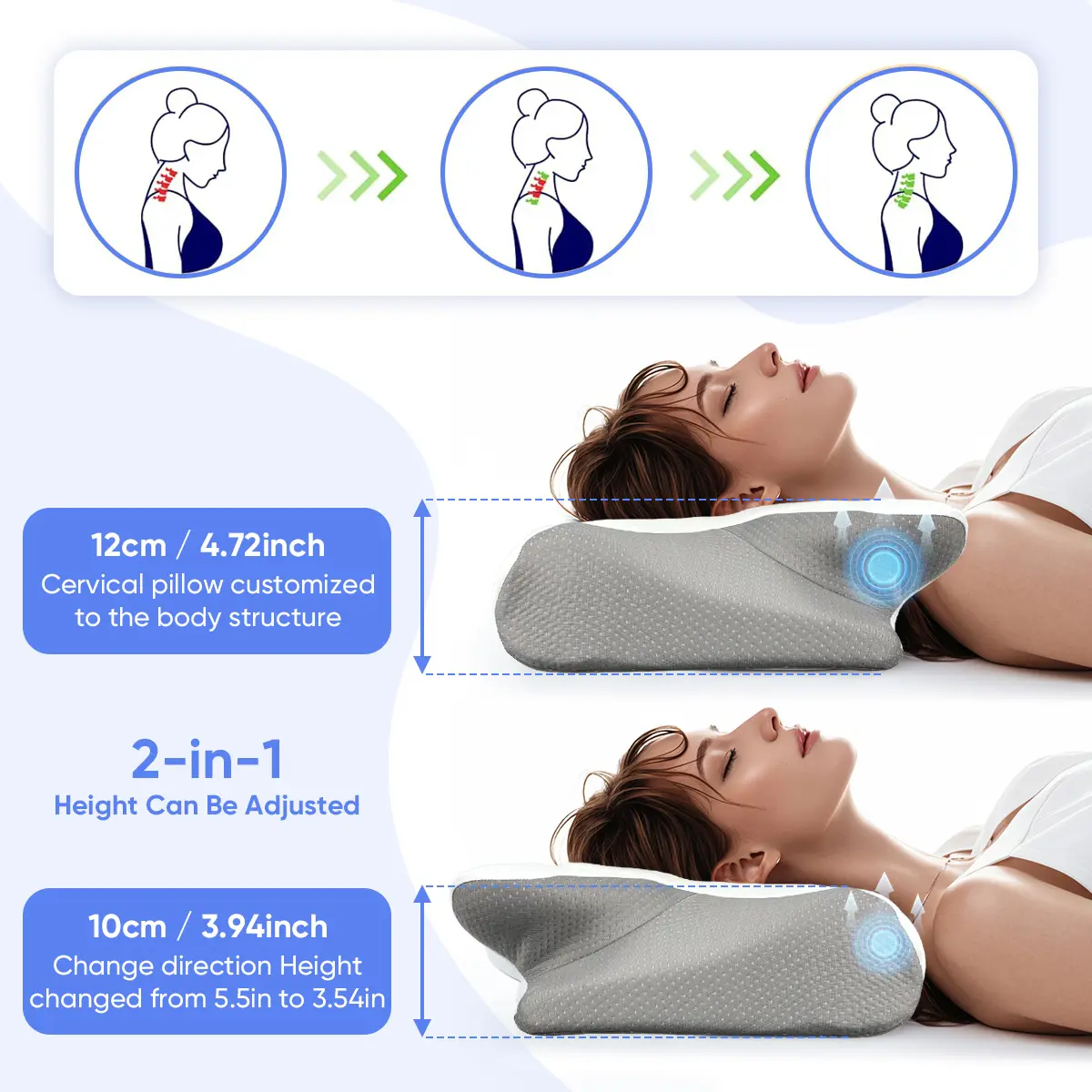 ·2-in-1 Adjustable Height: Features dual height options (12cm/4.72inch & 10cm/3.94inch) to customize fit for different body structures and sleeping positions, suitable for both back and side sleepers.
