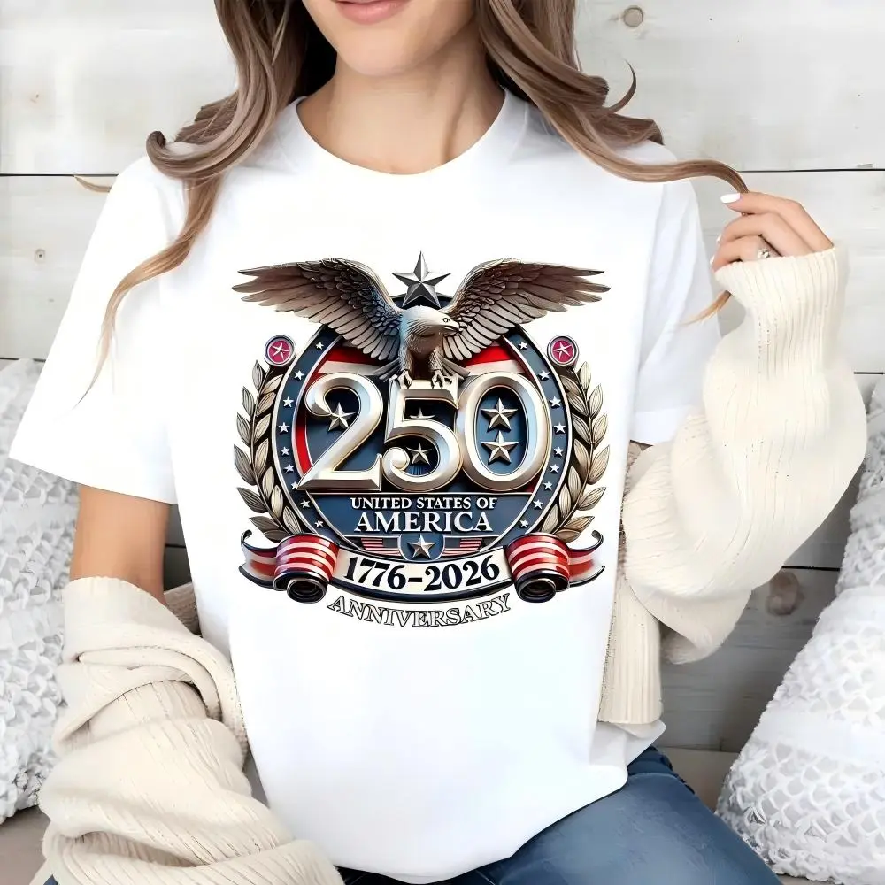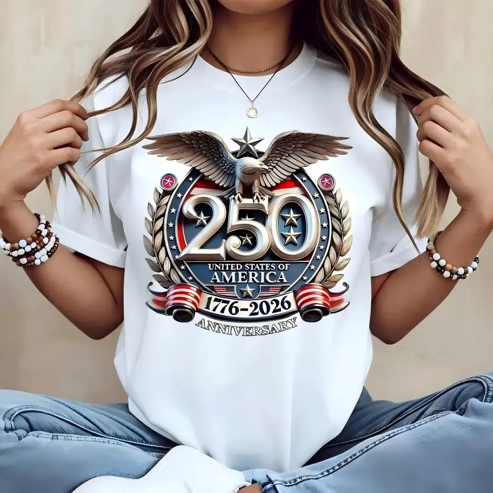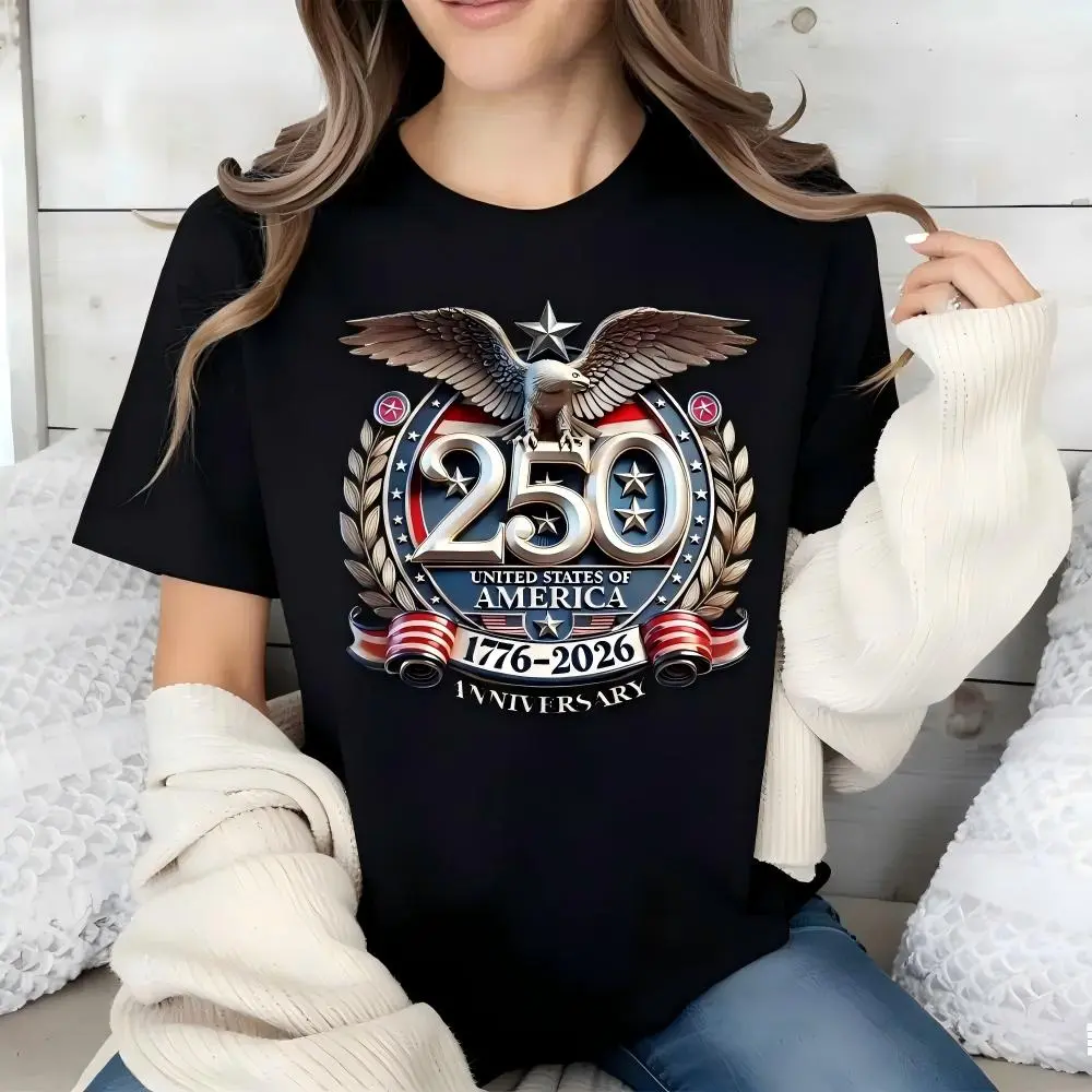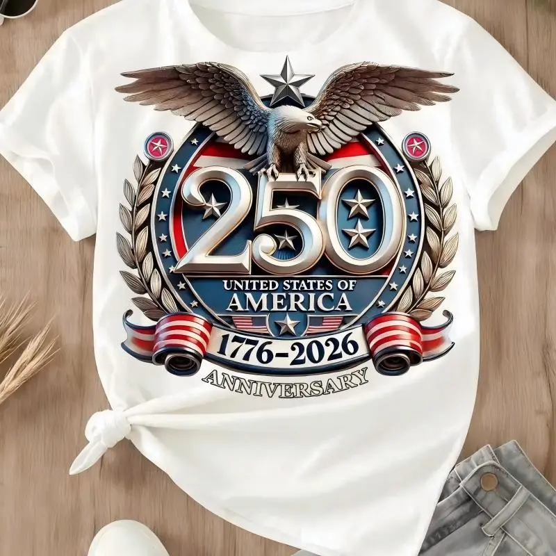 Anniversary Design: This T-shirt commemorates the 250th anniversary of the United States of America, from 1776 to 2026. It features an eagle and stars print, perfect for celebrating this significant milestone.
