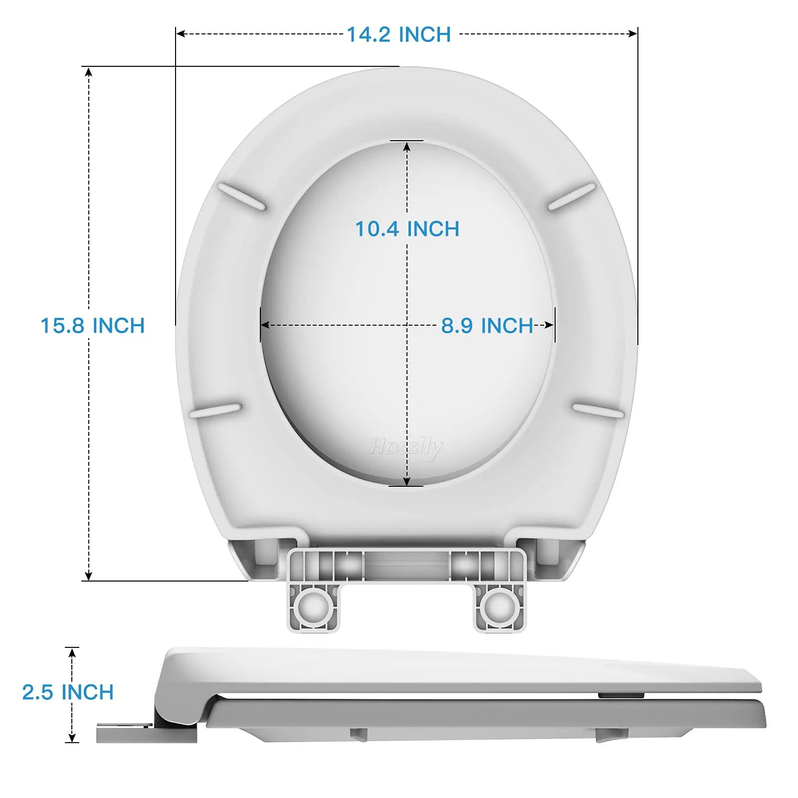 This is a ROUND toilet seat. Standard size: Length 16.2–16.7 inches, Width 14.2 inches, with mounting hole distance 5.15–6.18 inches—suitable for most standard round toilet bowls. Please measure your toilet before ordering.