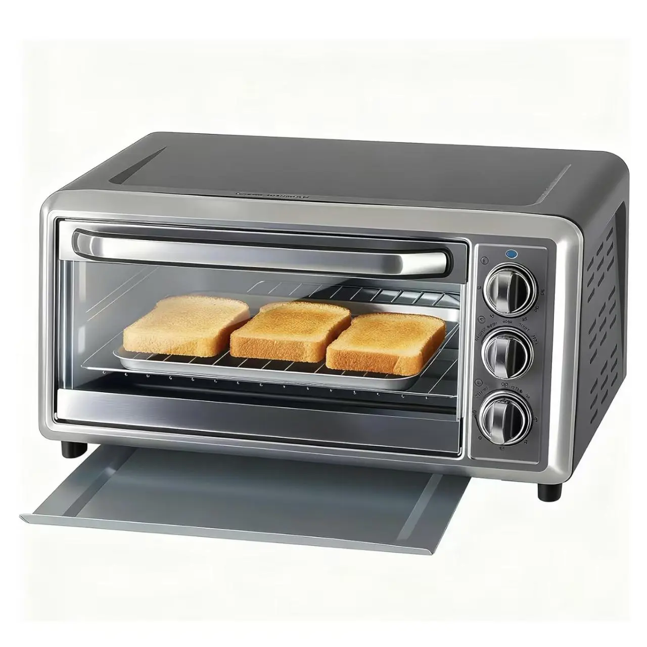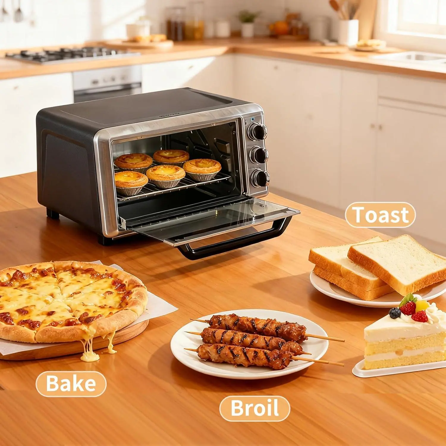 Five cooking modes in one oven: Bake, Toast, Broil, Pizza, and Warm. Bake cookies, toast bread, broil meats, make crispy pizza, or keep dishes warm. This oven simplifies daily cooking, replacing multiple appliances. Enjoy consistent, delicious results with ease.