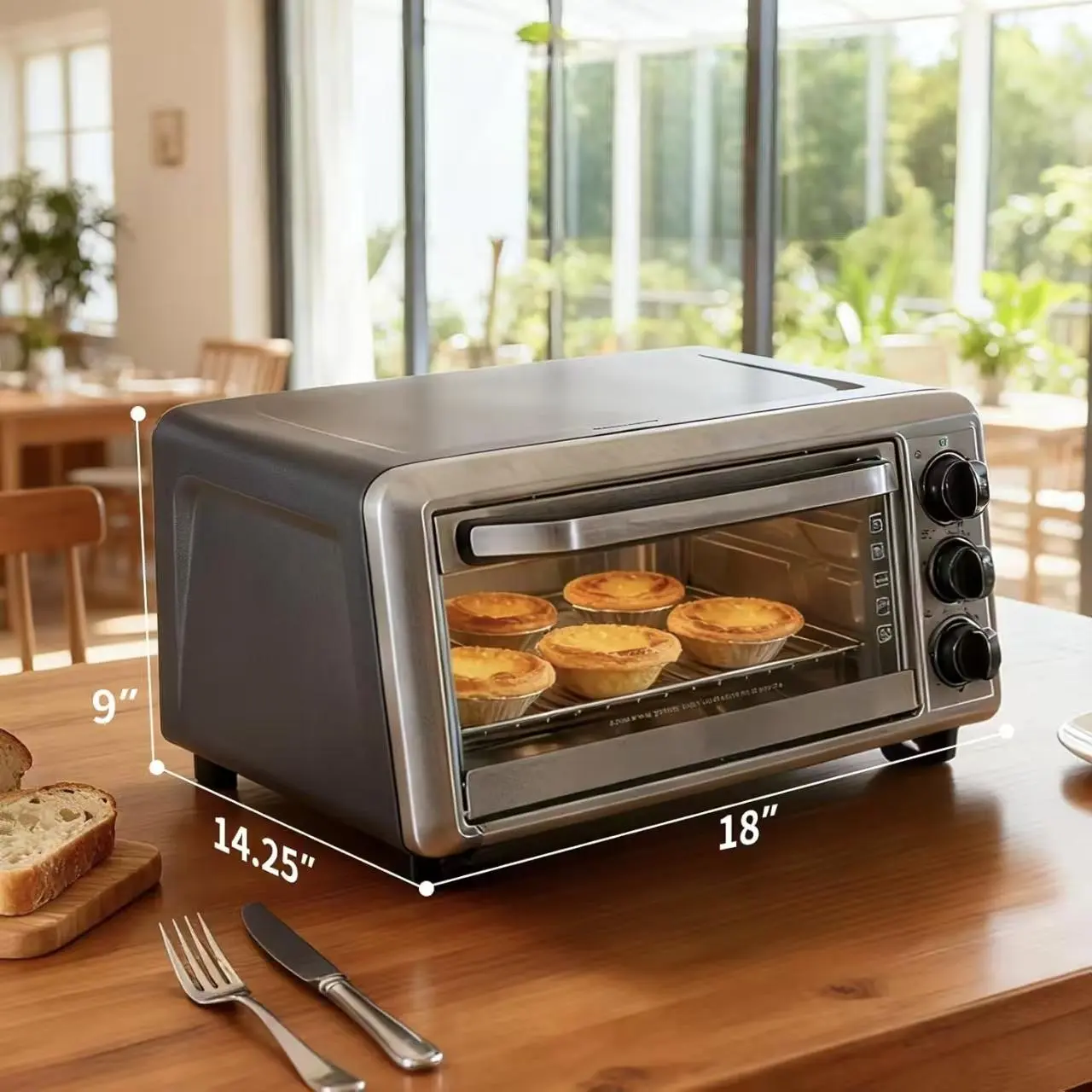 Upgrade your countertop with this 1300W 5-in-1 Toaster Oven. It excels in baking, toasting, broiling, pizza making, and warming. Perfect for family meals, dorms, apartments, or RVs. This compact oven replaces multiple appliances, simplifying your cooking. Enjoy versatile cooking in a small space.