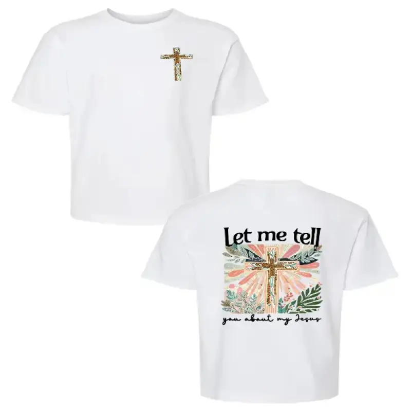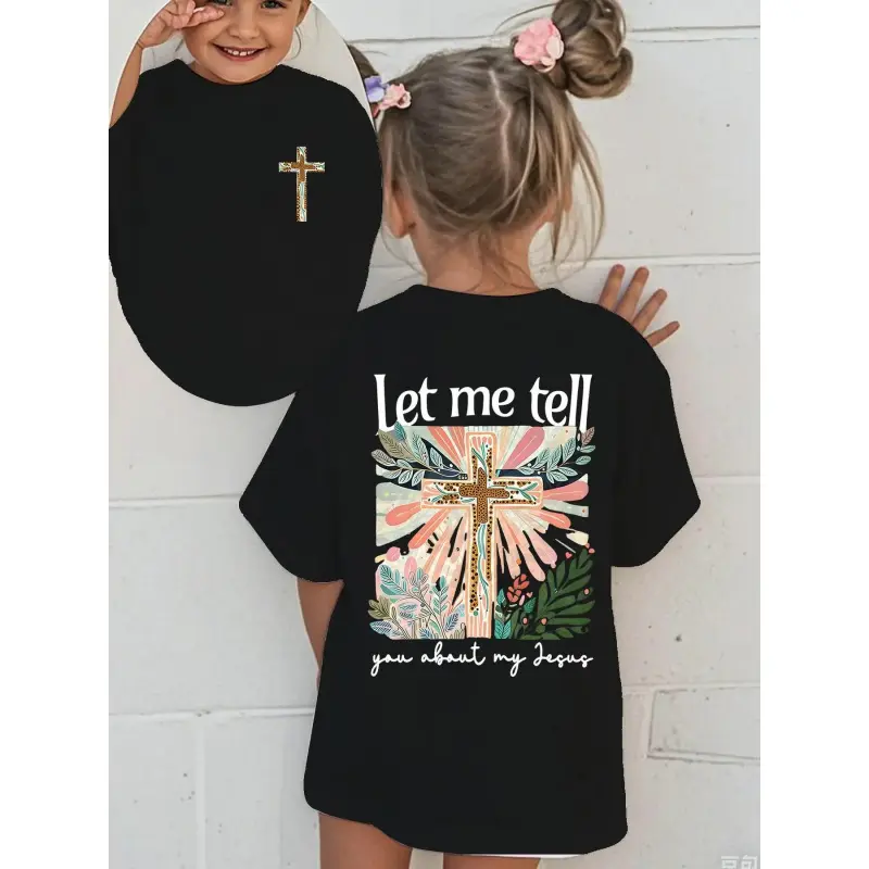 Colorful Graphic Black T-Shirt for Girls - Features Floral Cross Design and Inspirational 'Let me tell you about my Jesus' Text | Adorned with Pink Hair Clips, Perfect for Casual Wear | Stylish and Eye-Catching Top for Young Fashionistas