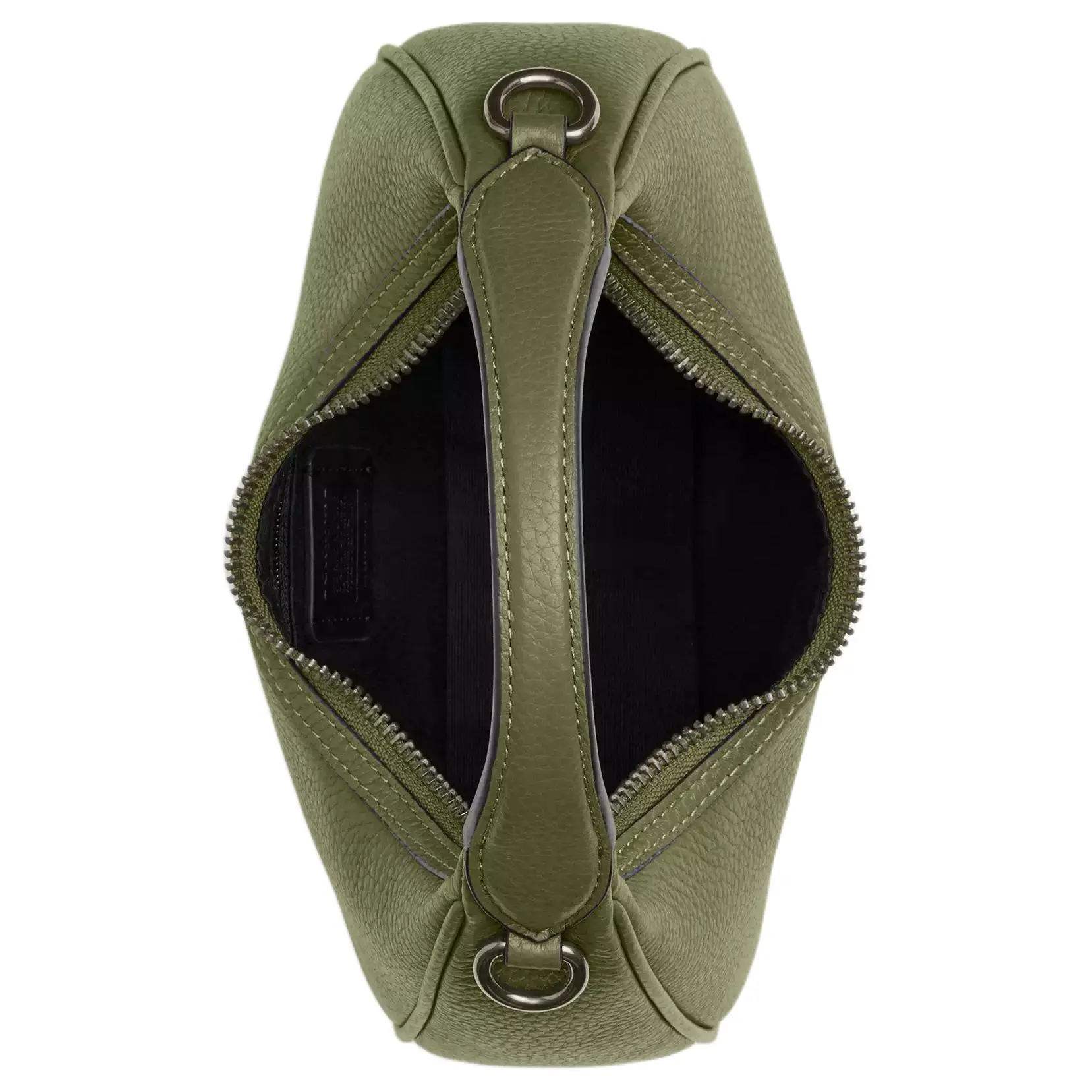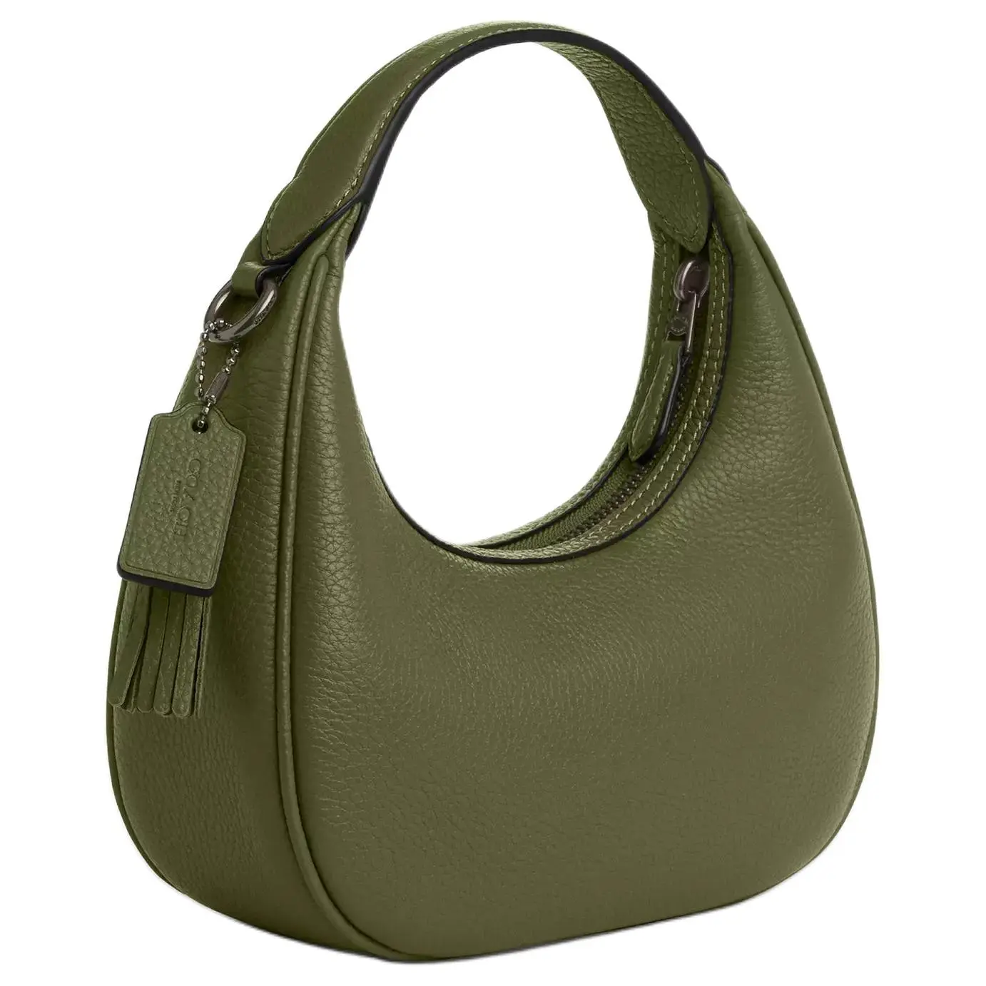 Materials: Premium pebbled leather (calfskin-derived) for the main body; smooth leather trim; antique-finish gunmetal hardware; cotton twill lining with interior slip pocket and COACH creed patch.