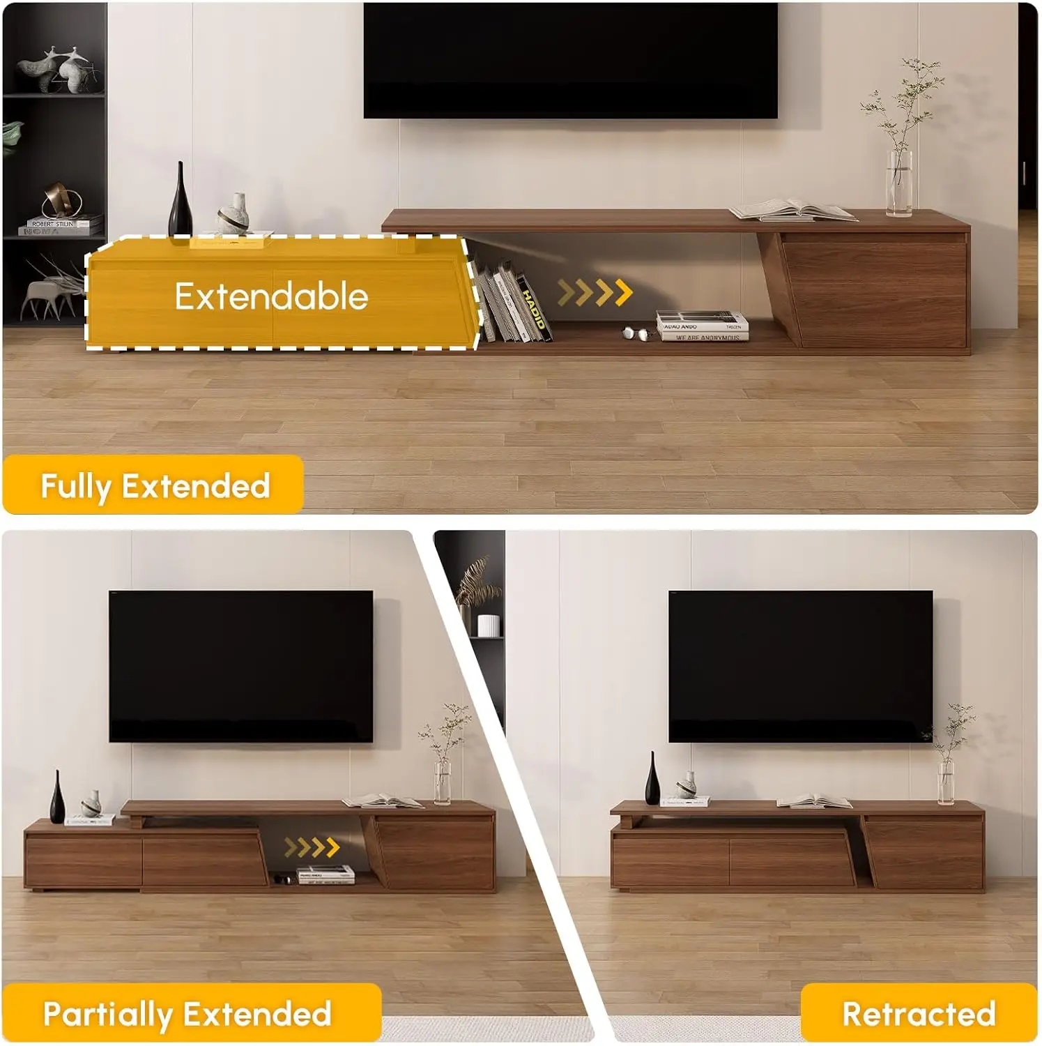 ·Adjusts to Your Space: Expand or retract the TV stand from 70.9” to 110.2” wide to fit your living room layout perfectly—ideal for apartments, open spaces, or changing home setups.