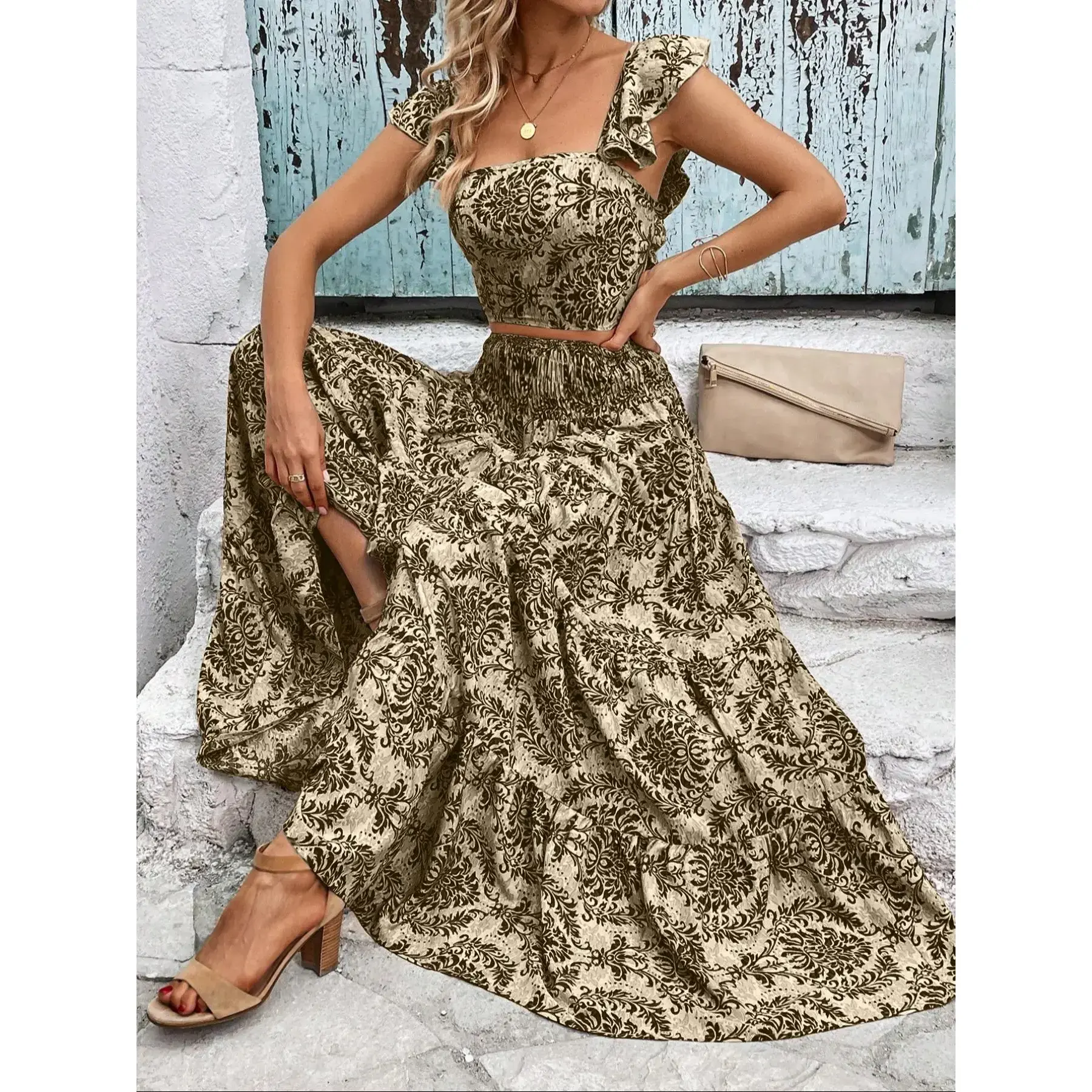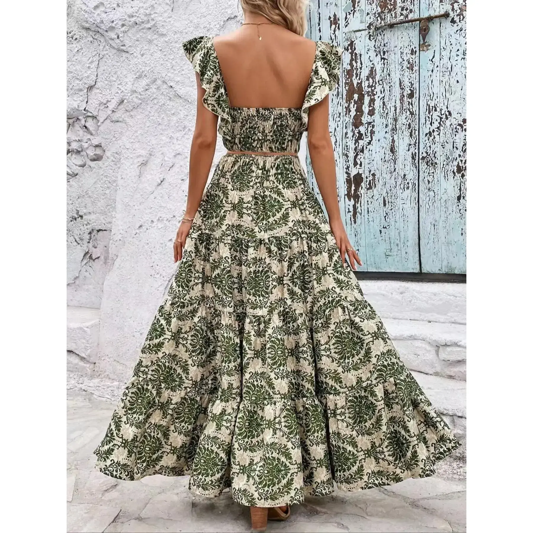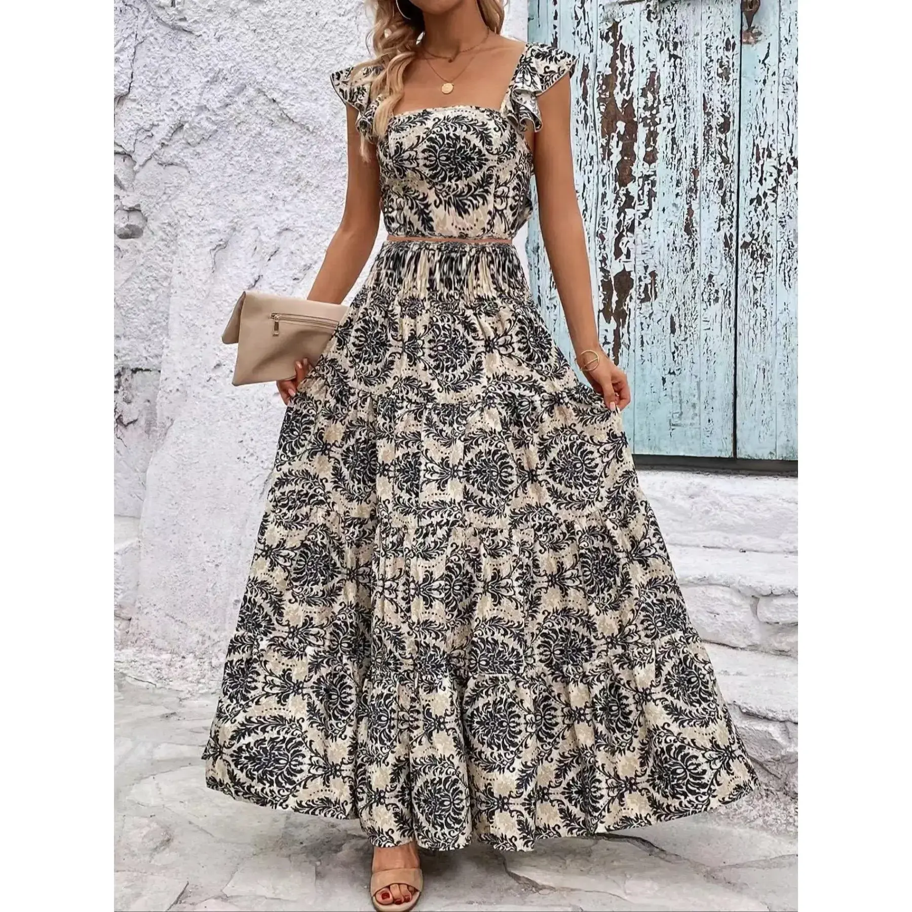 Women's Ethnic Pattern Butterfly-Sleeve Fitted Crop Top & Shirred High Waist A-Line Skirt Set, Womenswear Summer Boho Elegant Square-Neck Top & Ruffle-Hem Long Skirt for Beach Vacations and Holidays