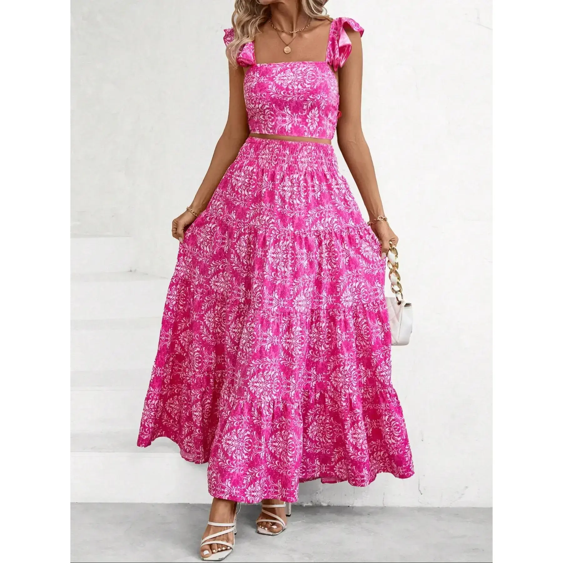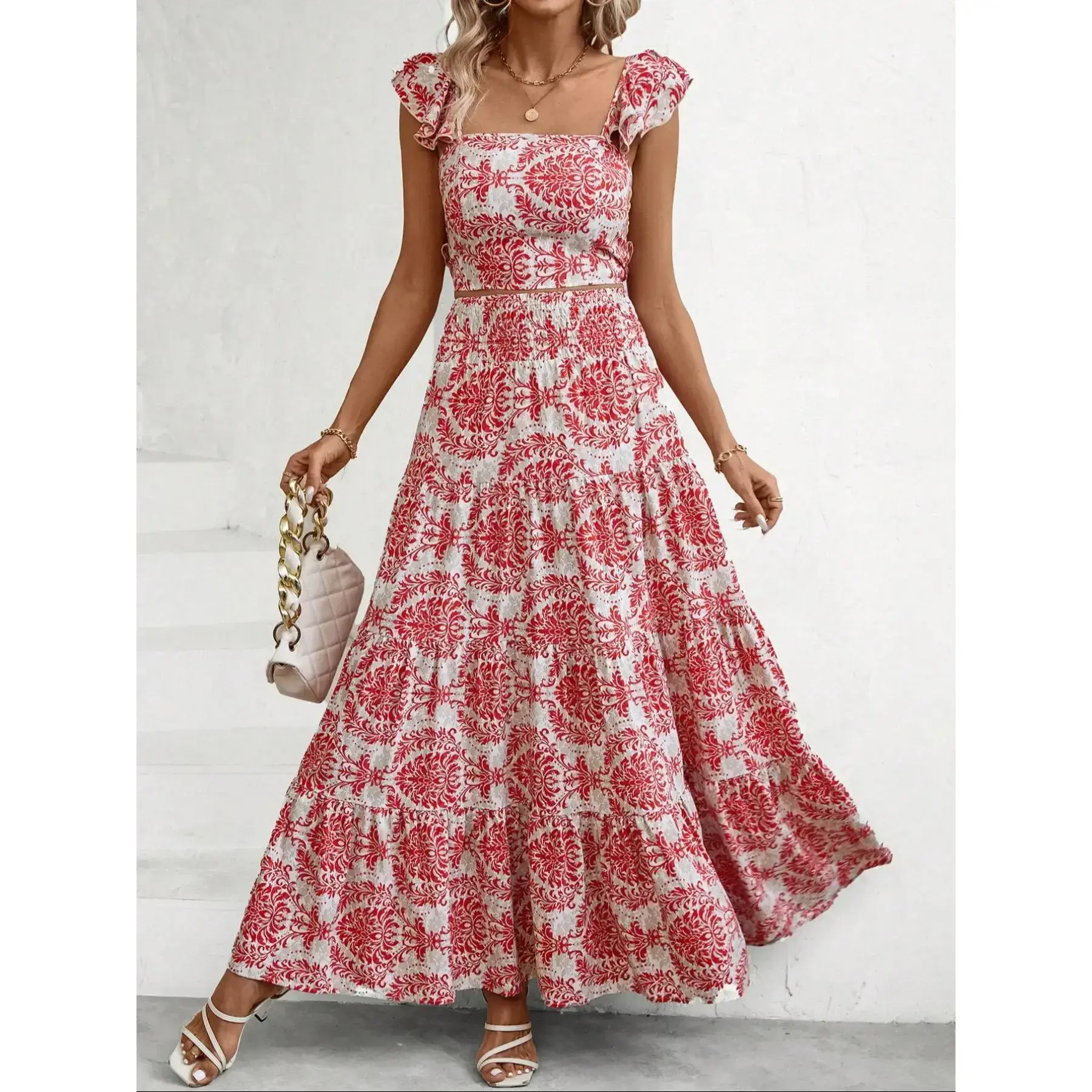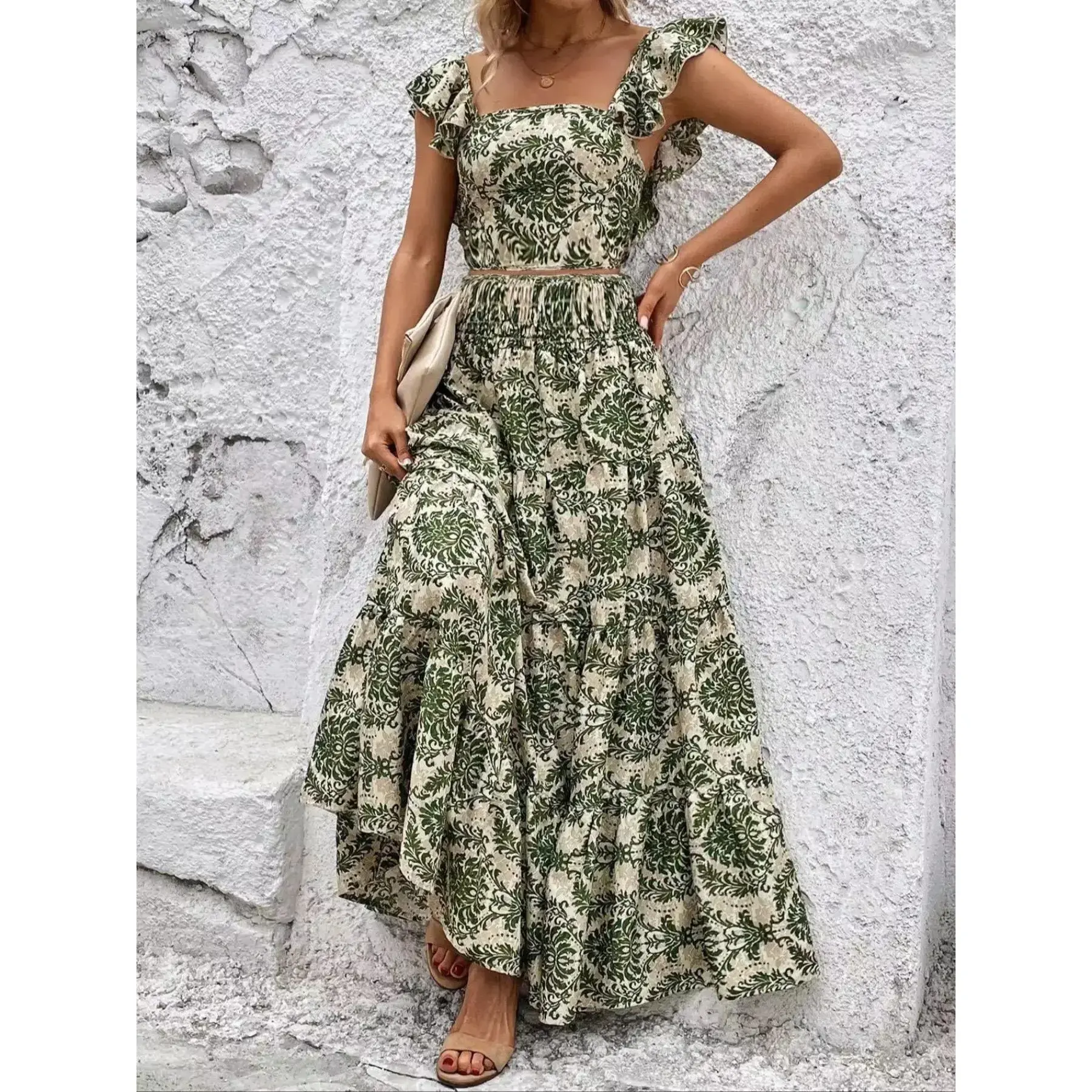 Women's Ethnic Pattern Butterfly-Sleeve Fitted Crop Top & Shirred High Waist A-Line Skirt Set, Womenswear Summer Boho Elegant Square-Neck Top & Ruffle-Hem Long Skirt for Beach Vacations and Holidays