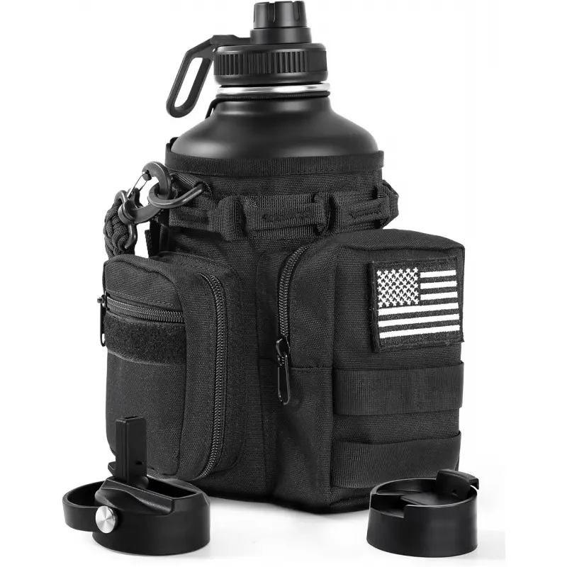 Tactical Half Gallon Water Bottle: This tactical water bottle is designed with double wall vacuum insulation to keep your drinks at the right temperature all day long, giving you cool ice water on hot summer days and heart-warming hot water on the slopes.The 64 oz capacity sports water bottle keeps you hydrated throughout the day for all-day summer workouts and camping