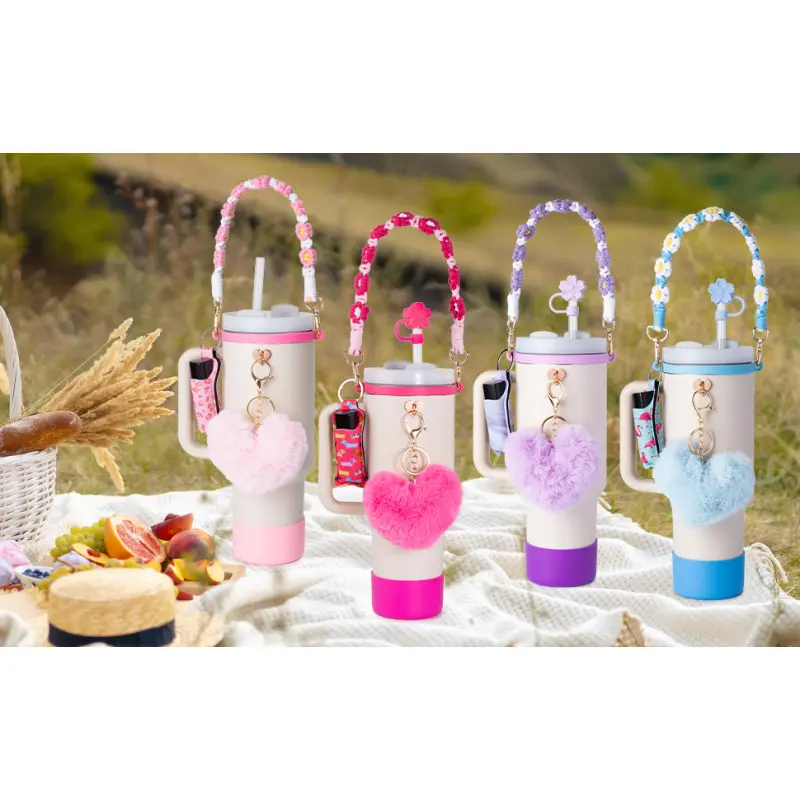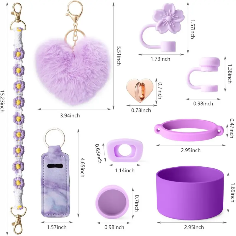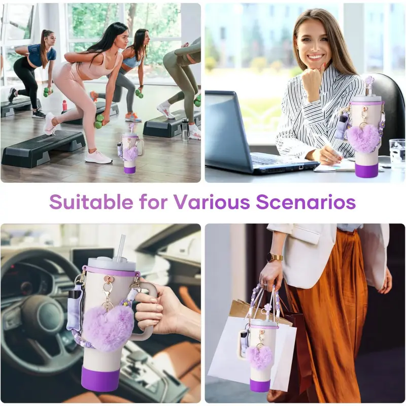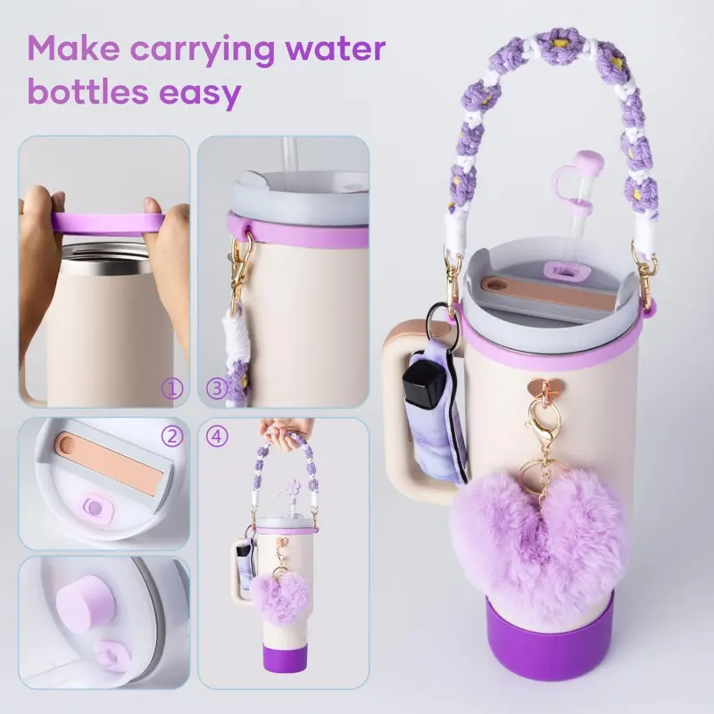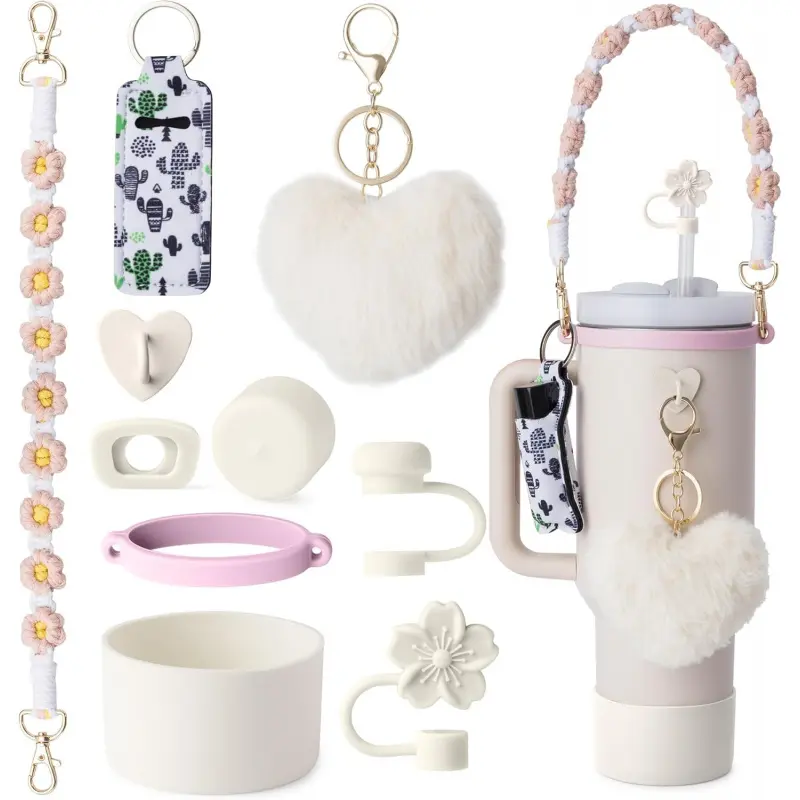 Charming Cup Accessories: Carrier strap for and protective cup Boot, Straw topper and Spill Stopper Set are suitable for carrying outside, various outdoor activities. And cute lipstick Holder, pompom ball Keychain Charms for DIY and decor, these accessories make your Cups looks so much more fun and special. These accessories for Cup are and fashionable. Carry Your Tumbler Around Easier: This handle water bottle carrier come with a durable bohemian woven handle strap and elastic silicone ring who perfectly fits your Pink cup, let you to easily carry your mug around. And the cute pompom ball keychain and lipstick holder means you no longer have to struggle to find keys or lipstick, simplifying your out-goings. Excellent Protection: The silicone leak-proof stopper features a 360 ° leak-proof design, while the straw topper covers is compatible with 9-11mm diameter straws, and the bottom protector protects the cup from impacts, scratches, slips, and prolongs the life of the cup. This set can meet your needs of protecting and dressing up your cups. Dress Up Your Tumbler: The silicone cup boot with diameter of 2. 96inch fits for 8-40 oz bottles such as Quencher Adventure 30 & 40 Oz, tumblers, Hydroflash bottles,, providing excellent defense against scratches, slips, dents. And You could hang on your keys on your cup with the lovely pompom ball keychain, and lipstick bag for your lipstick or some pocket money, simplifying your outings. Ideal decorative gift for cup accessries for, your friends and family. Well Packaged: These accessories are well packaged in a box, 1PCS Cute Braided Carry Strap for Cup and 1PCS Elastic Cup Ring, 1PCS Water bottle Protective Boot, 4PCS Straw Cover Cap and Spill Stopper Set, 1PCS lipstick Carrier Holder, 1PCS pompom ball Key Chain hanger. Designed for Cup Accessories 30/40 oz.