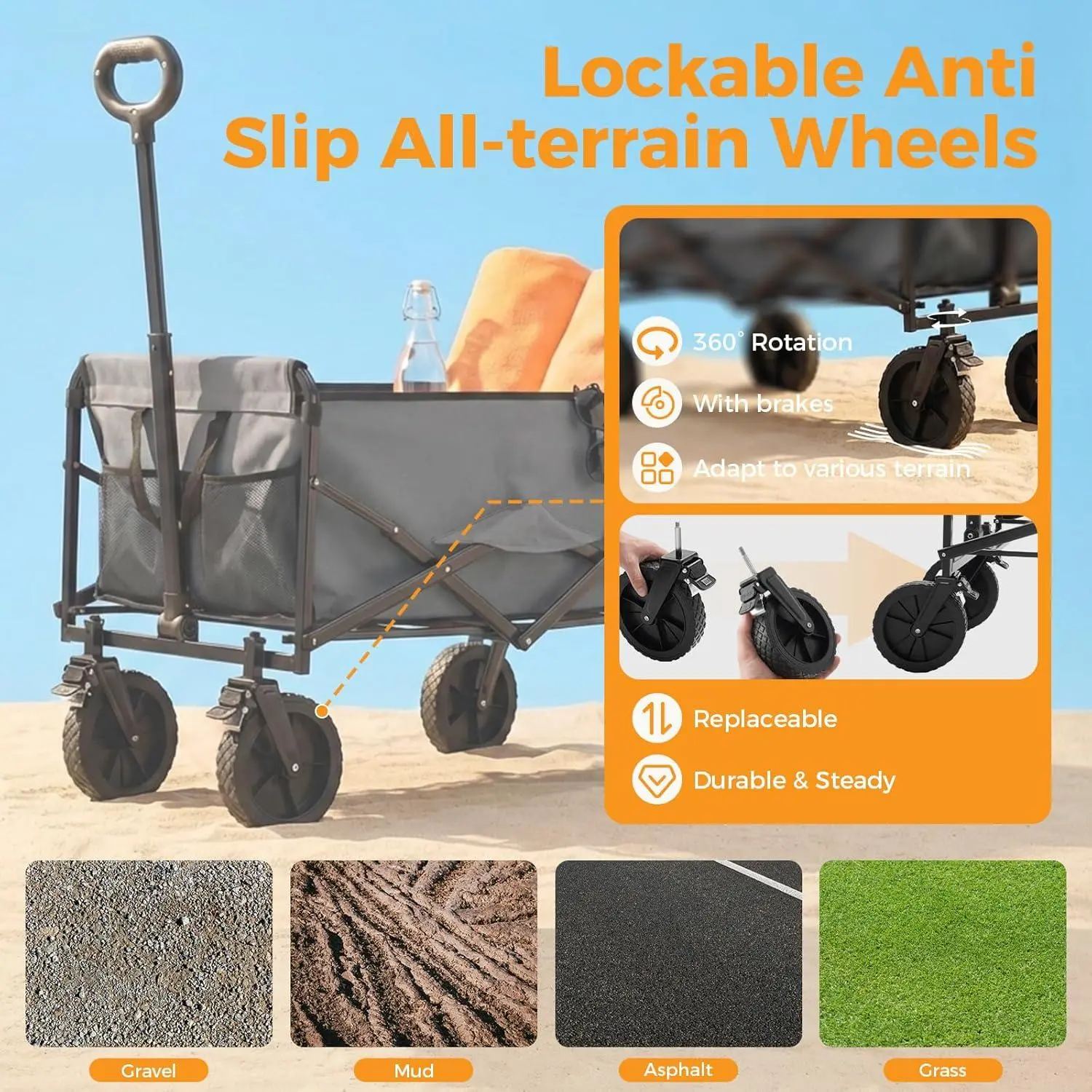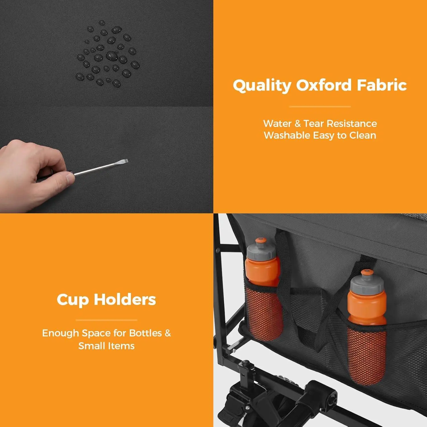 Made from 600D high-density Oxford cloth, this cart is waterproof and scratch-resistant. Its sturdy structure withstands outdoor environments and heavy use. The cart features dual mesh pockets on the front for easy access to small items like water bottles and tools.
