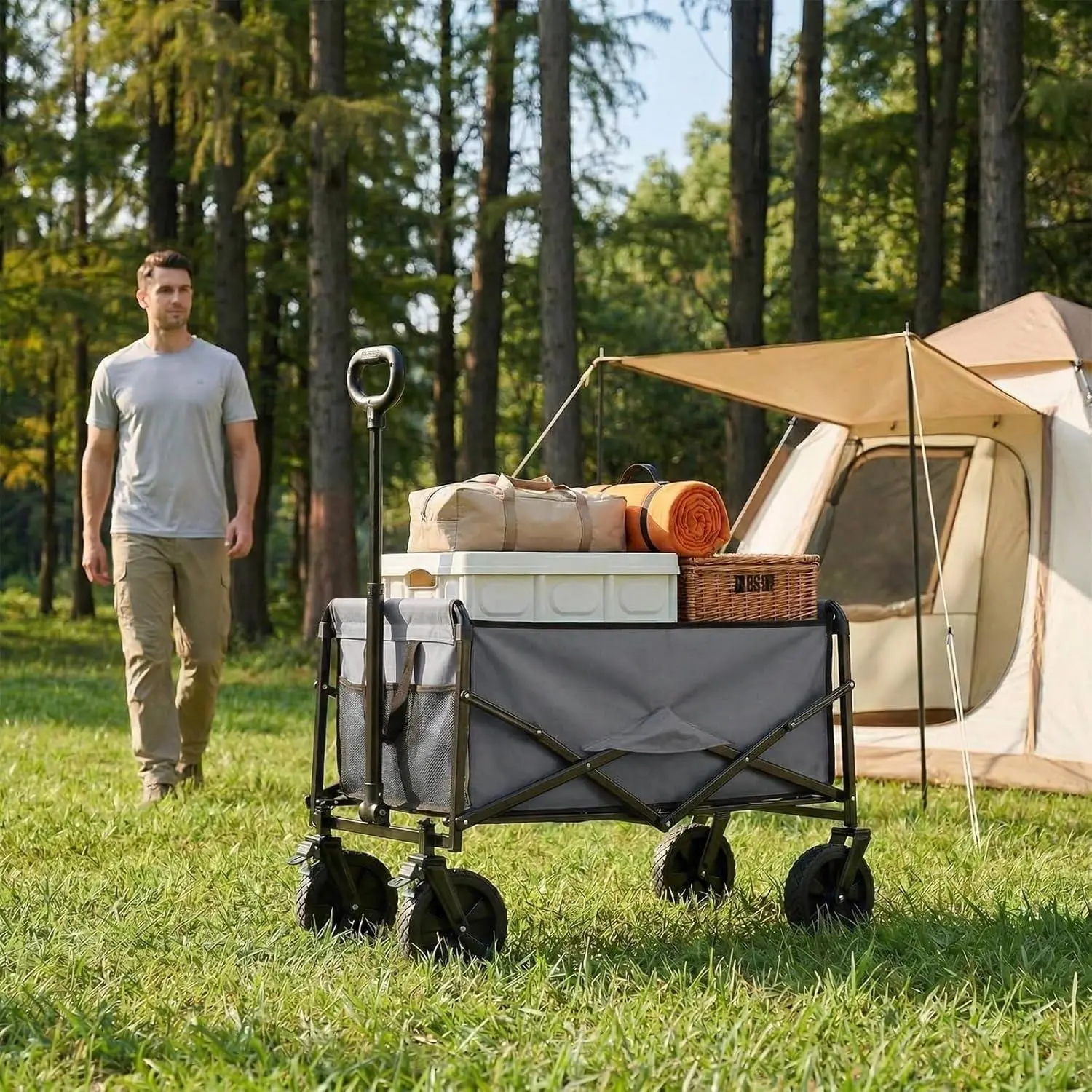 The cart supports quick folding, with removable wheels and handle for easy storage. The adjustable handle accommodates various pushing and pulling postures. Dimensions: 28.74" D x 18.7" W x 35.45" H. Ideal for camping, beach outings, park picnics, and more.