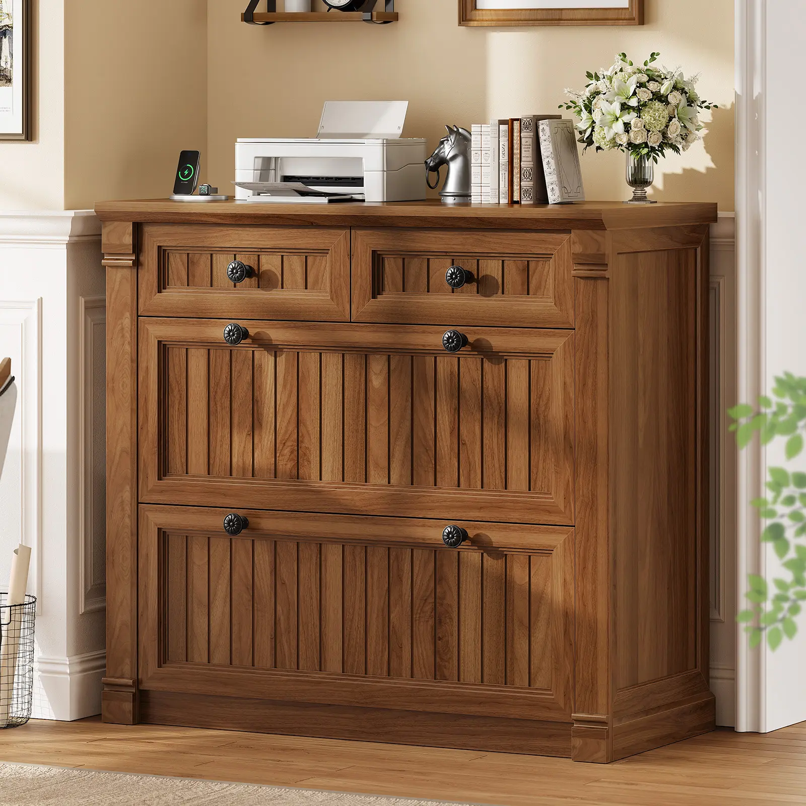 ·📁【Farmhouse Style】This charming farmhouse-style file cabinets for home office showcases vertical stripes for a rustic, elegant look. The printer stand with storage clean lines and textured finish blend seamlessly with bold American styling, industrial-grade MDF, and quiet confidence. Sturdy enough for stylish enough for Zoom backgrounds.