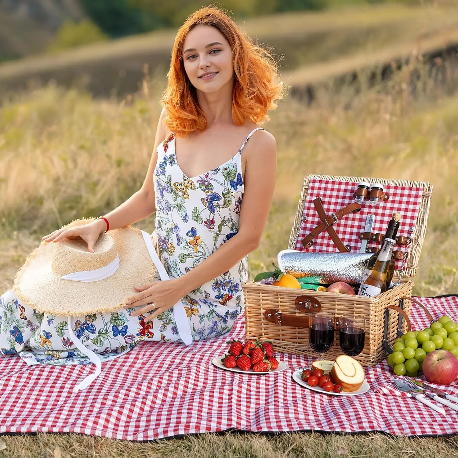 Each basket comes with a 57" x 47" waterproof blanket. Made from breathable cotton/polyester, it keeps you dry on damp grass. Perfect for beaches, backyards, parks, or hiking. The blanket ensures comfort in any outdoor setting, enhancing your picnic experience.