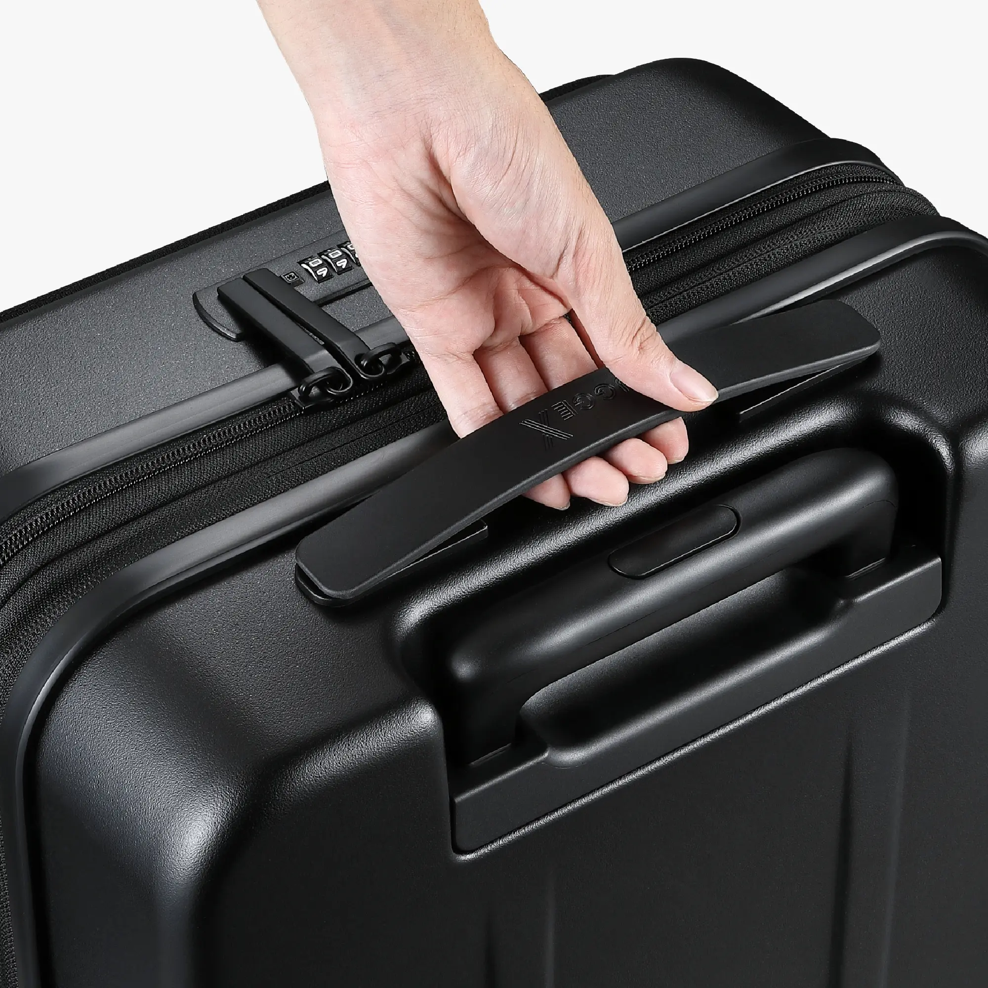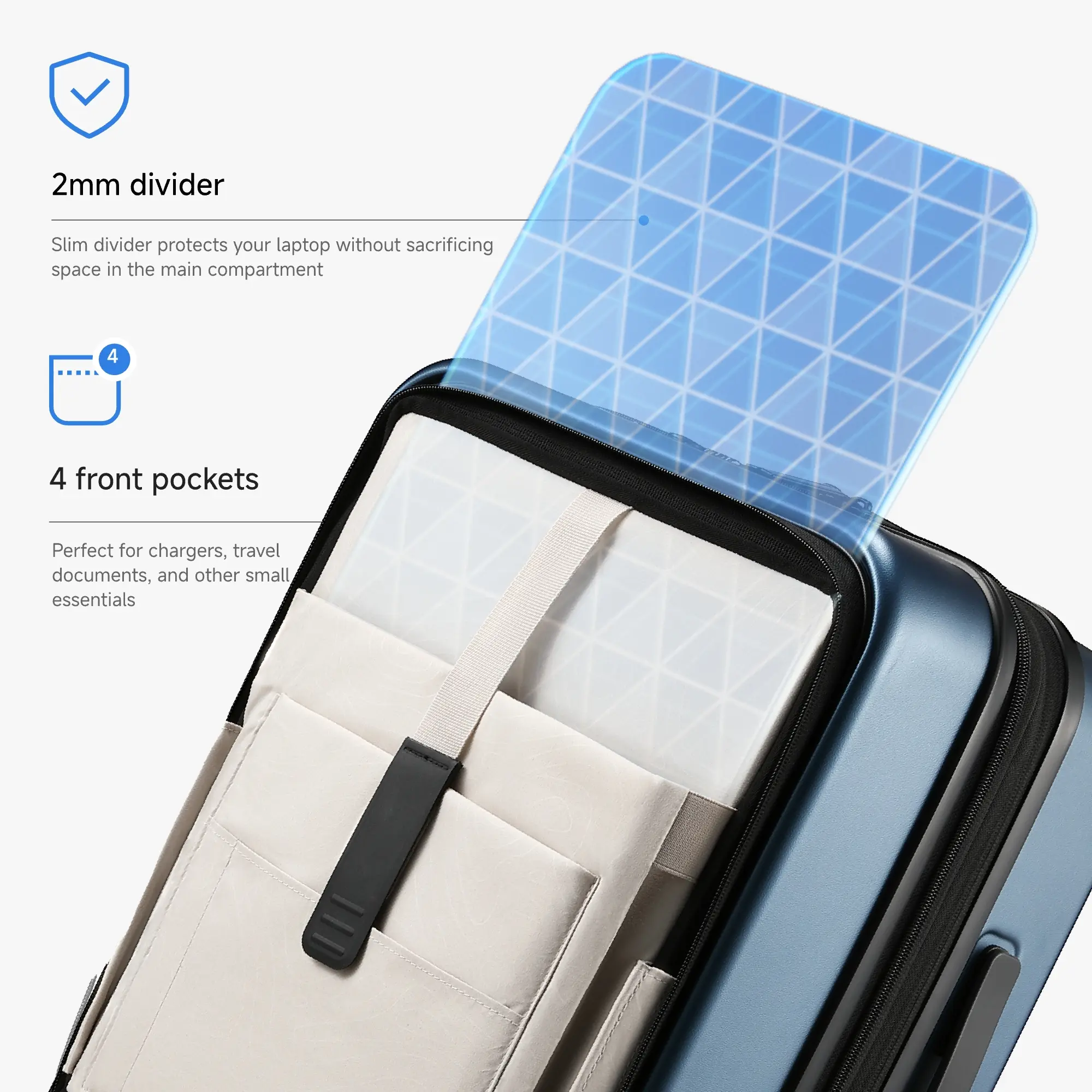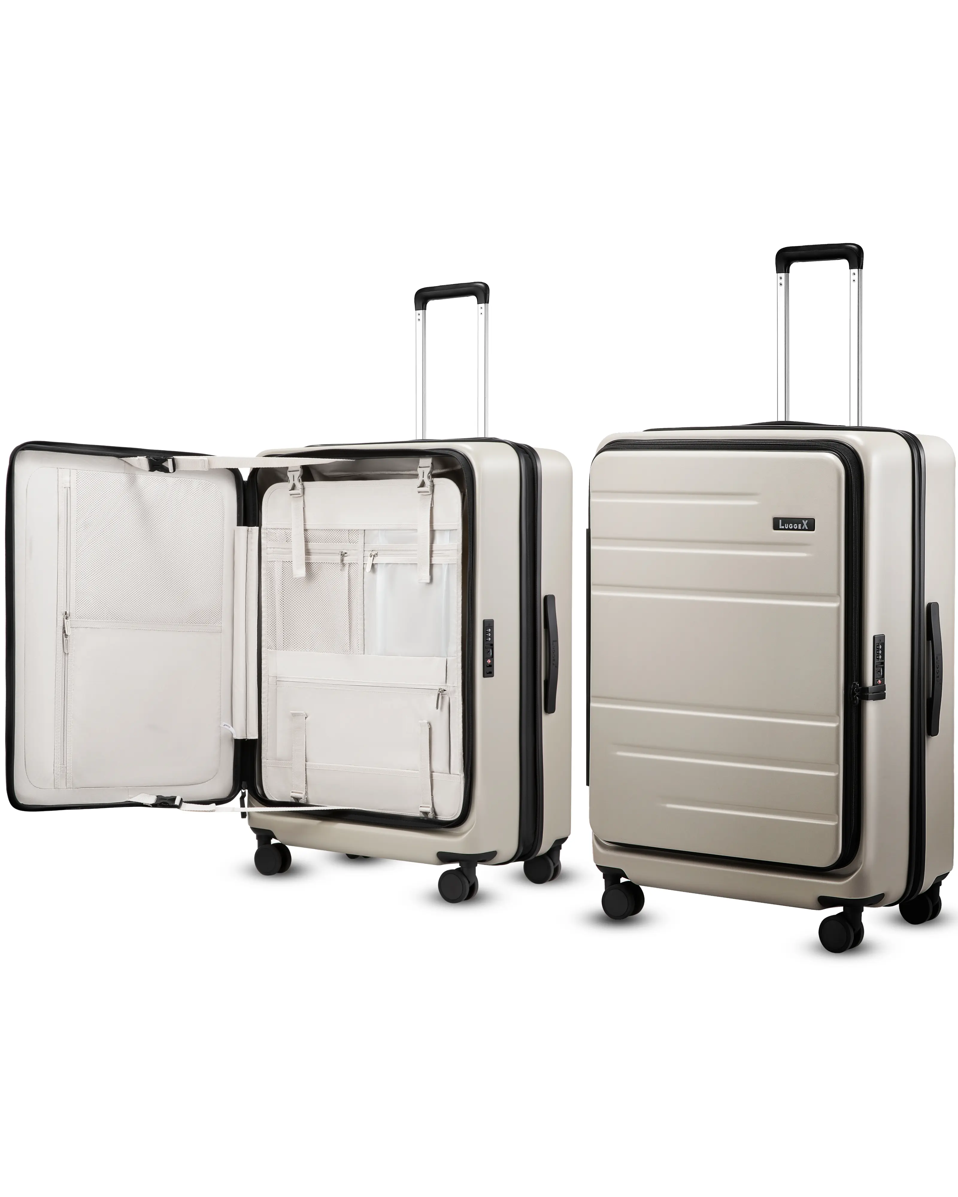·【FLO5 Vertical Access System】Tired of wrestling with luggage on the floor? FLO5’s innovative vertical-open design lets you access your belongings upright in narrow aisles or against a wall, saving valuable space and keeping your clothes off the ground—perfectly built into this 28 inch luggage with spinner wheels.