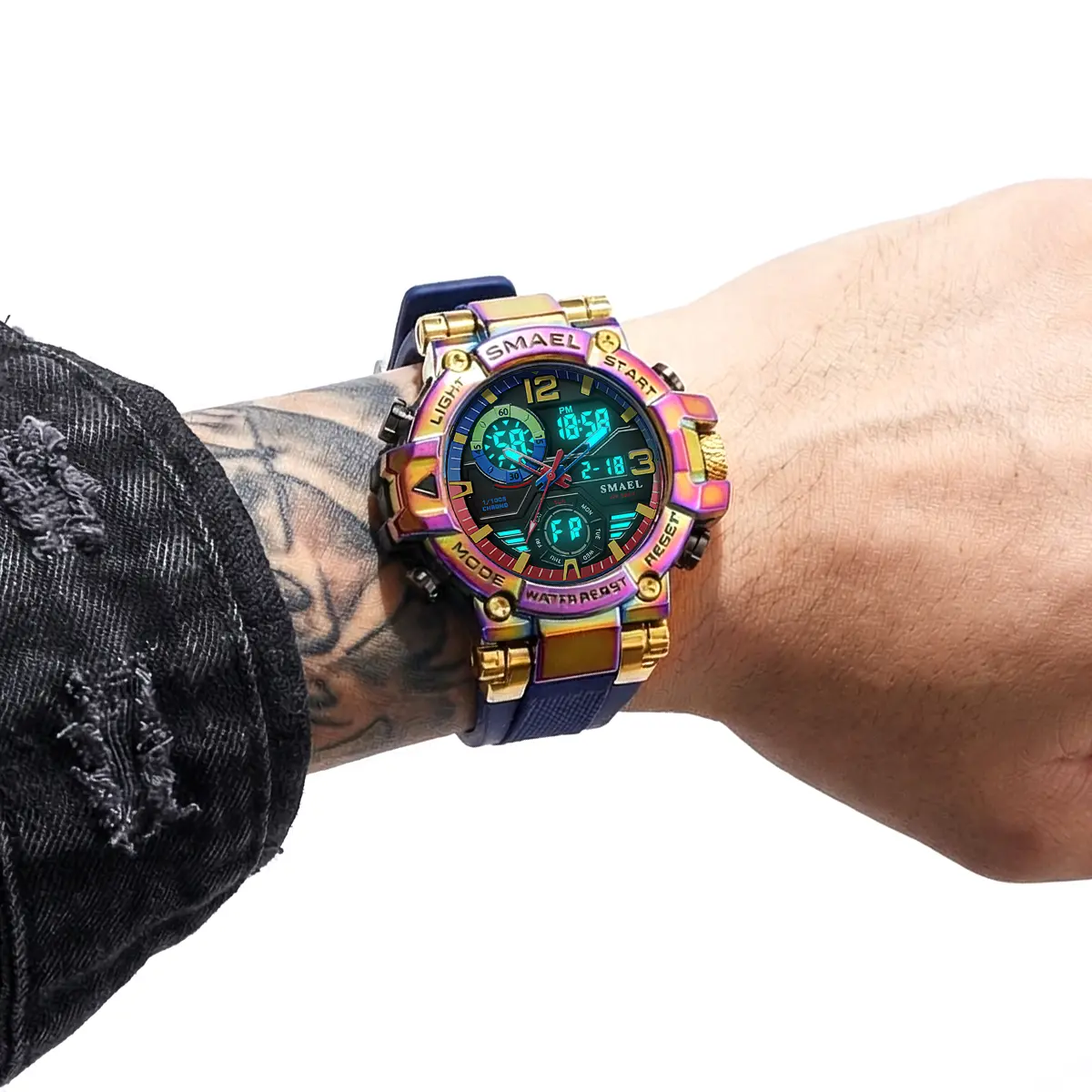 Men's Colorful Punk Style Quartz Watch, Jumpstart saleMulti.Functional Waterproof Dual Display Wristwatch,Tren, sportive analog-digital quartz watch, Birthday Giftwith Gift Boxfashionable wristwatch multifunctional men