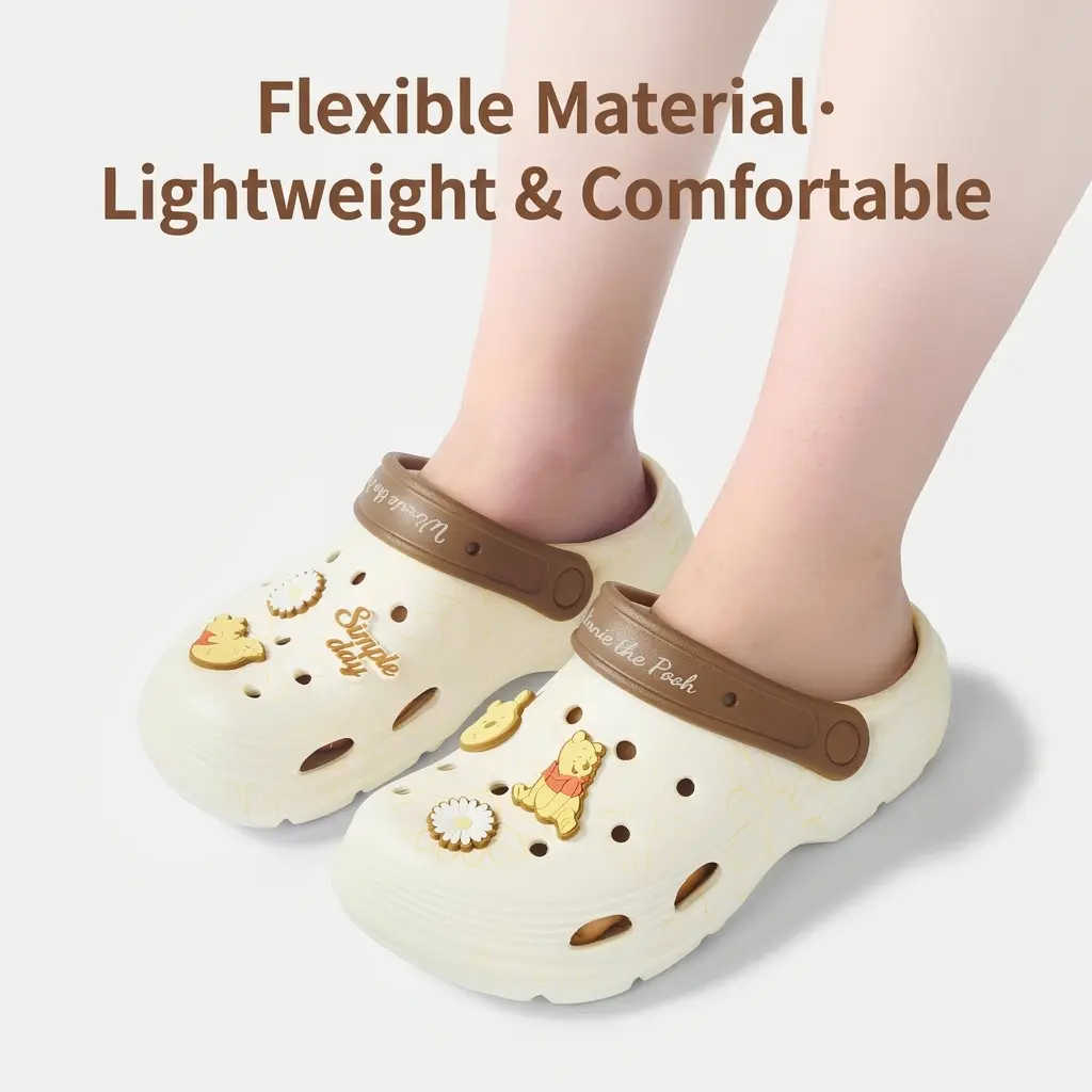 Each pair comes with detachable Pooh-themed charms featuring Winnie the Pooh himself, letting you customize your shoes to match your mood. Made from soft, durable EVA material, these shoes are easy to clean, waterproof, and odor-resistant — ideal for both indoor relaxation and outdoor errands.