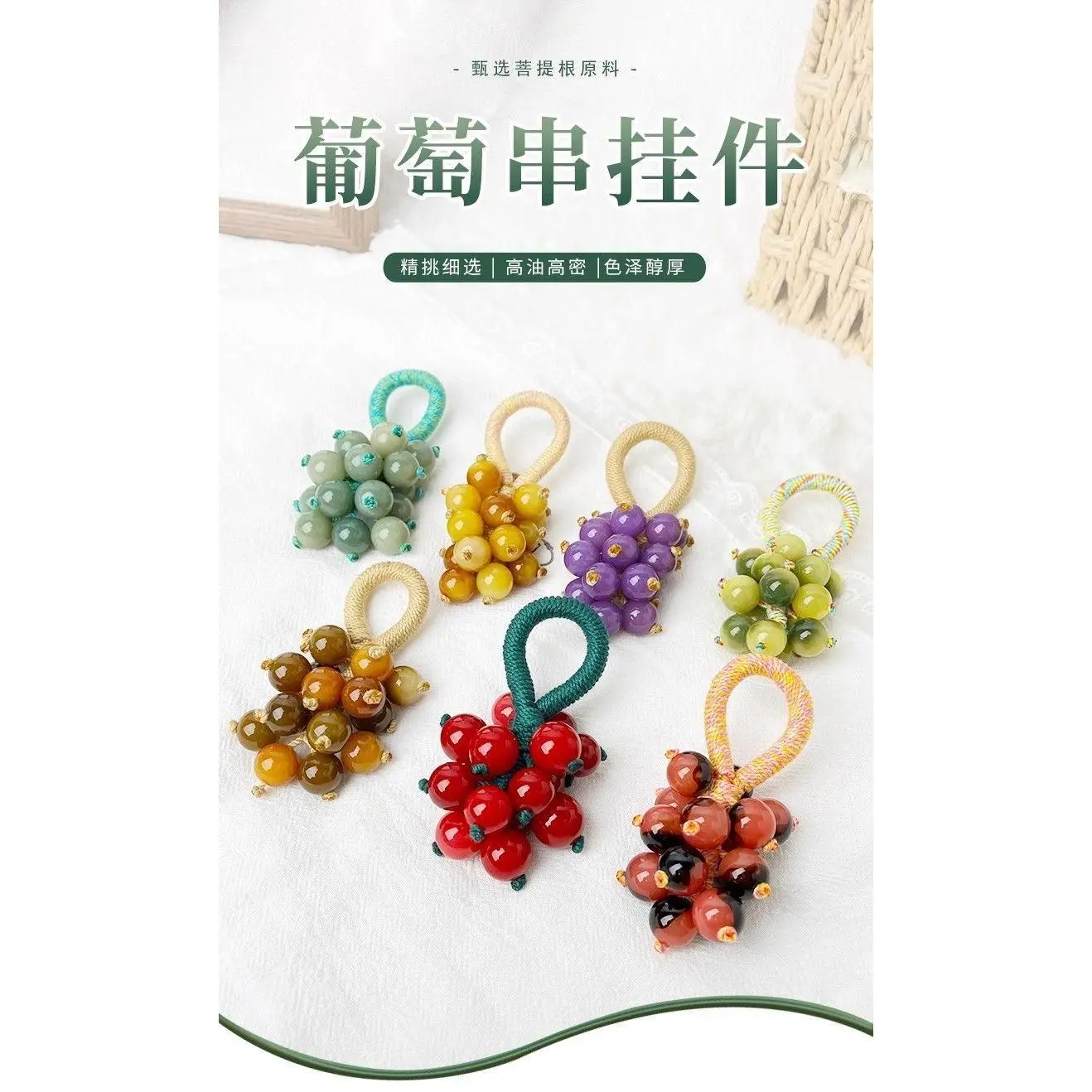 These bodhi bead grape clusters come in a variety of vibrant colors. Each cluster is handcrafted with smooth, round beads woven together, featuring colorful braided cords for easy carrying. They blend natural texture with playful, eye-catching hues, making them a charming decorative piece, a lucky charm, or a stylish accessory for bags and keys.
