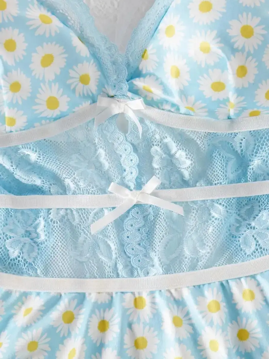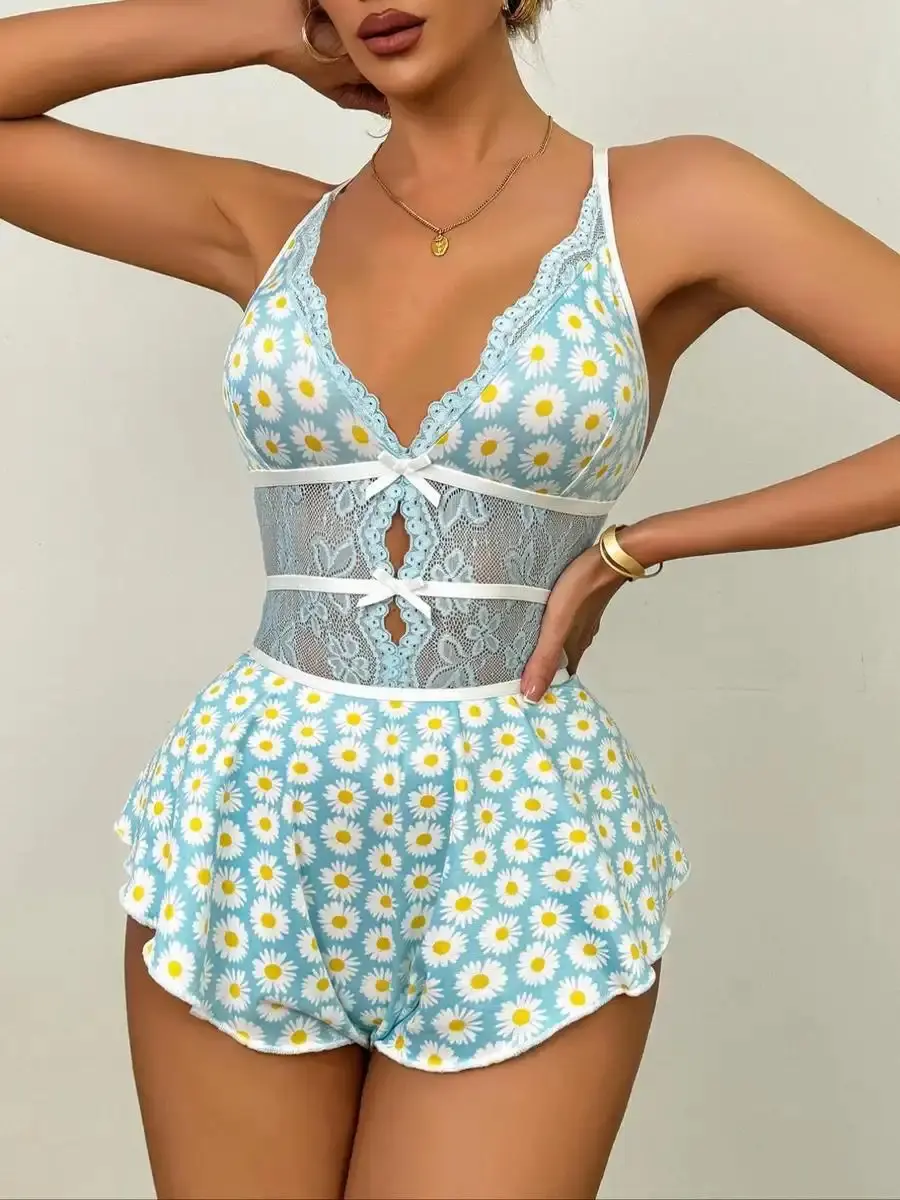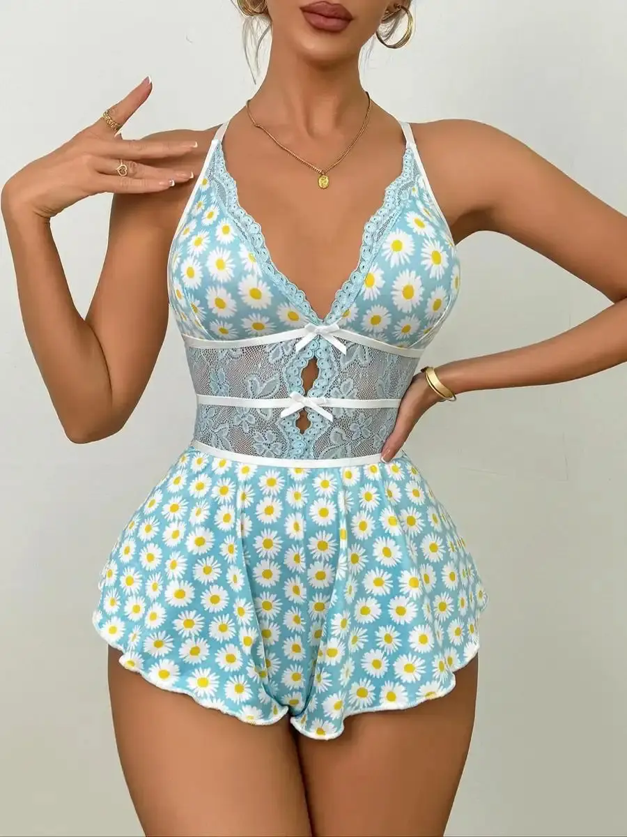 Women's Daisy Print Contrast Lace Sexy Cami Romper, Sexy Cut Out Sheer Lingerie Romper for Indoor, Ladies Summer Clothes, Rompers for Women