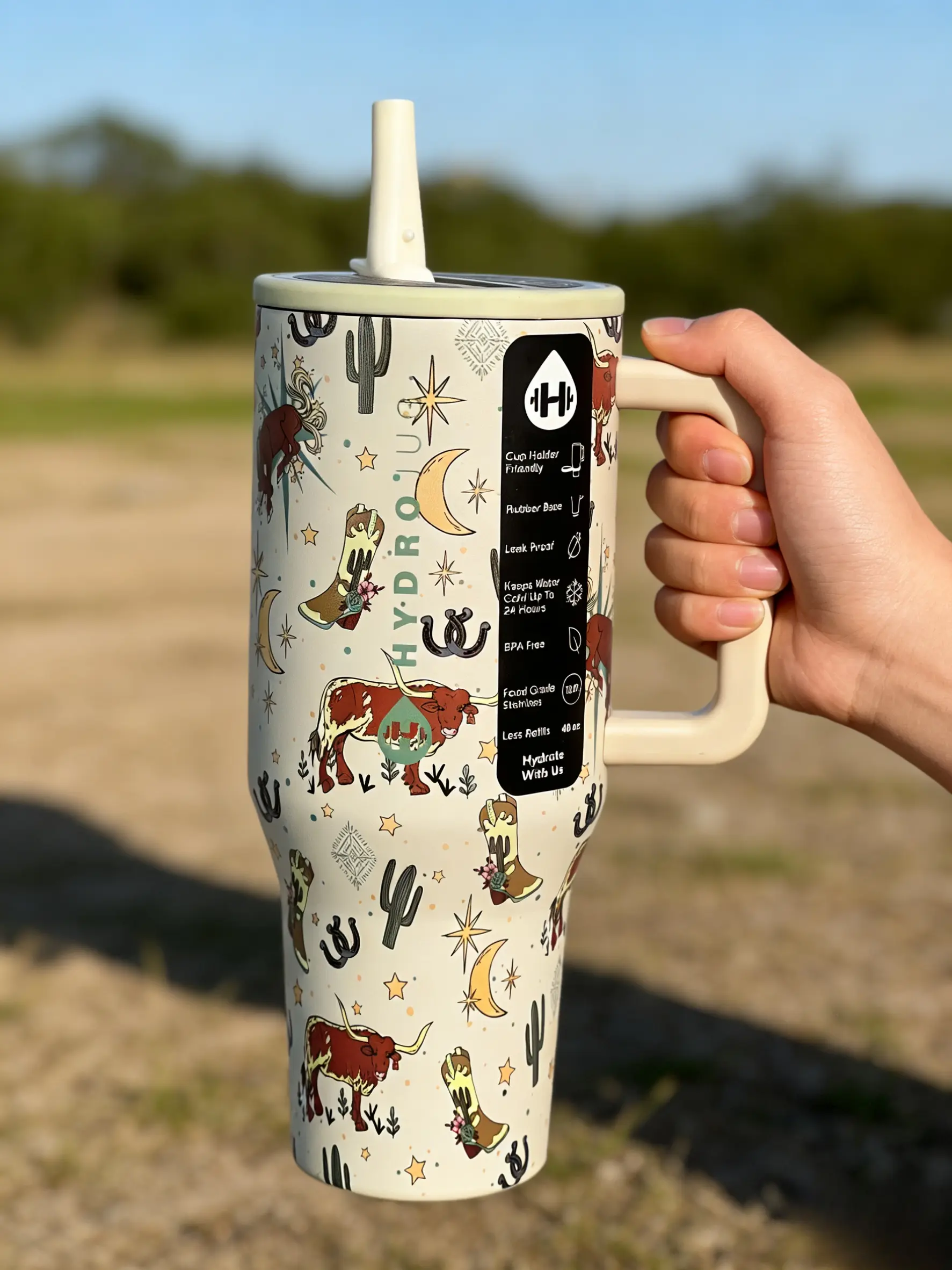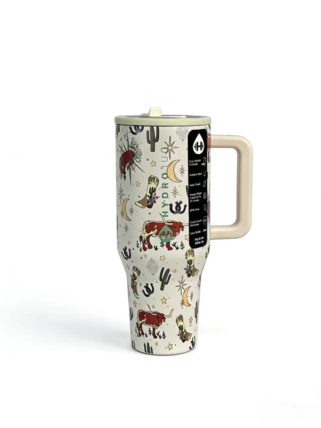 Discover the HydroJug 40oz Western Cowboy Tumbler, a portable drinkware marvel. This insulated stainless steel cup features a retro desert cattle design, perfect for cowboy enthusiasts. The leakproof lid ensures your drinks stay secure. Ideal for water bottles, flasks, and mugs, it's a versatile choice.