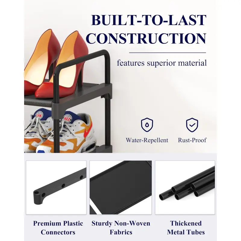 LONG-LASTING MATERIAL: Featuring thickened metal tubes and robust plastic connectors, this shoe rack ensures dependable support for shoe storage.The sturdy and tear-resistant non-woven fabric shelves securely hold all your shoes.Its rust-proof, water-resistant design allows for easy cleaning with a damp cloth.