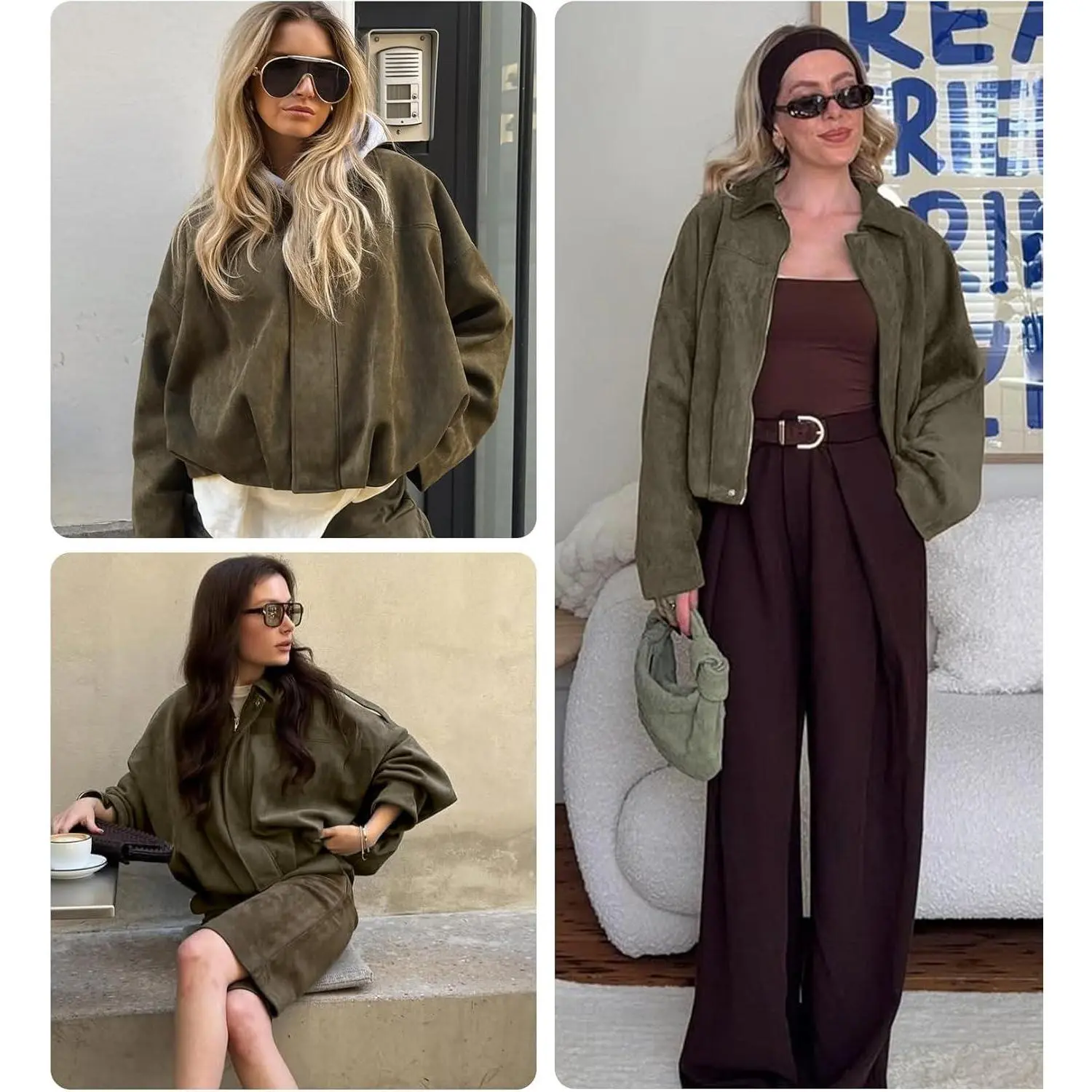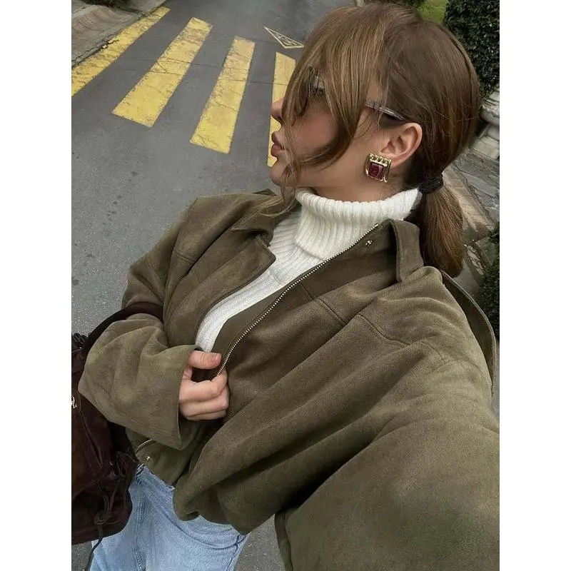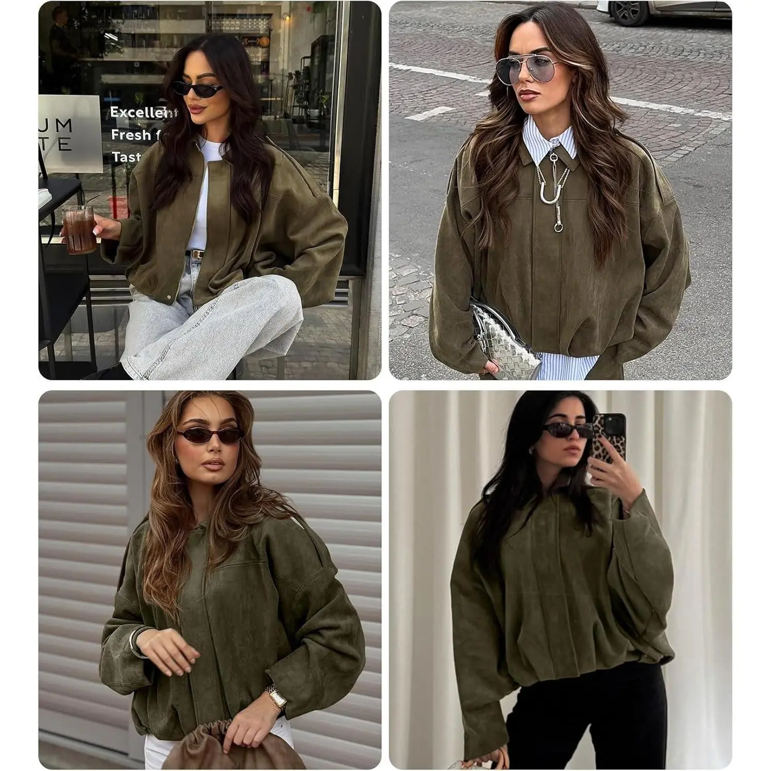 Elevate your everyday style with this Womens Suede Bomber Jacket. Designed with a soft suede finish and an oversized fit, it brings effortless street style and comfort to your spring wardrobe.
