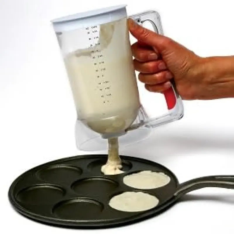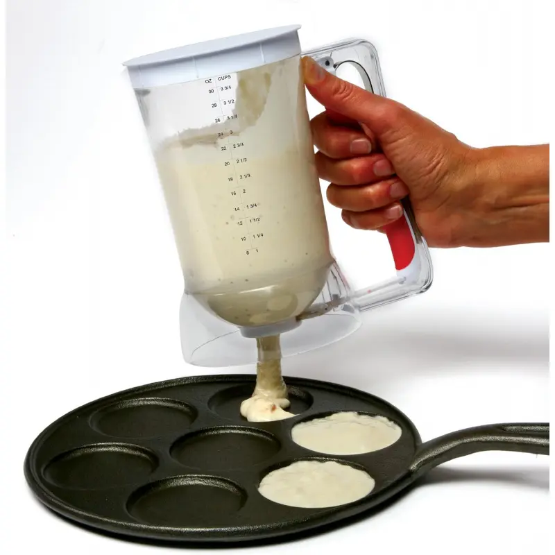 Mix and dispense your batter with one tool!No wasted batter and less mess.Easily and accurately dispense cupcake, pancake, crepe, waffle and other batters and sauces.Pull soft grip handle to dispense batter, release handle to stop the batter flow.Allows you to easily control the amount of batter you want to dispense.Easy to read measurements on the side in ounces, cups and milliliters.Easy to clean and store.