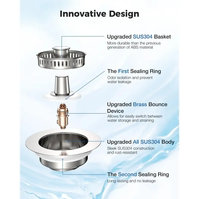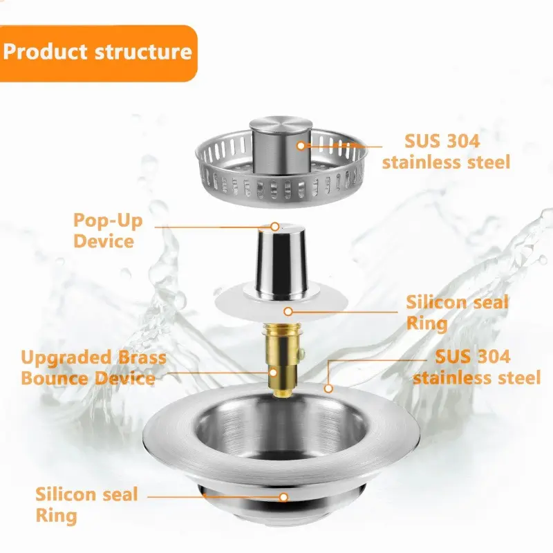 【Convenient ABS Pop-Up Spring Stopper & Removable Anti-Clog Basket】The kitchen sink drain strainer consists of a brass electroplated silver body and an ABS material kitchen sink drain basket. Brass electroplated silver is more durable and rust-free, and ABS is high temperature resistant. The pop-up sink drain stopper features a simple press mechanism, which allows for easy switching between water storage and quick drainage. Moreover, the brushed stainless steel 304 basket can be easily installed and removed