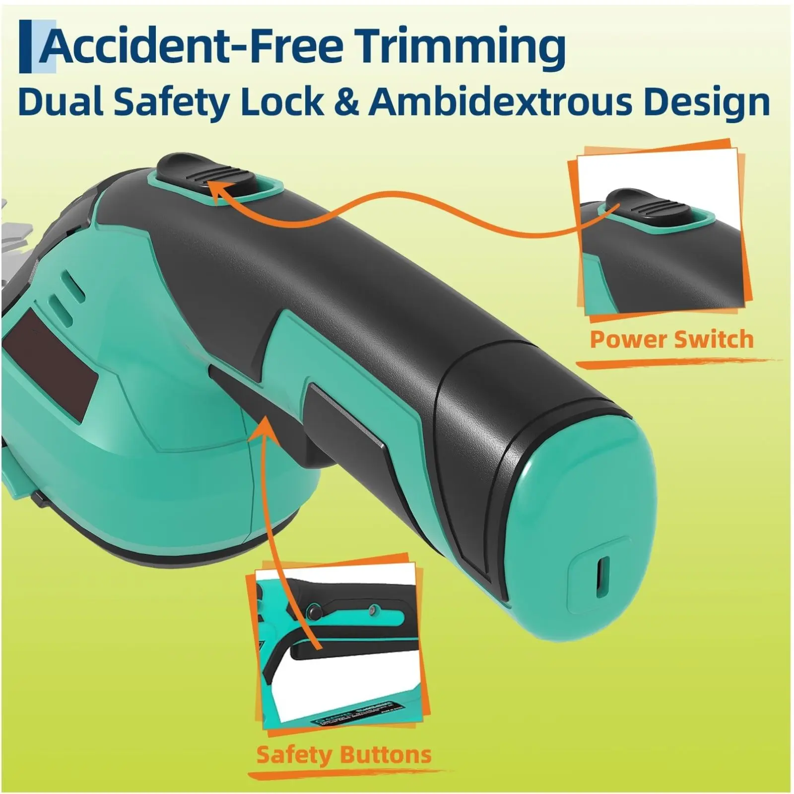 This cordless 2-in-1 trimmer features a 7.2V motor for quick switching between hedge trimming and grass shearing. Weighing only 2.2 lbs, it's lightweight for one-handed use with a top safety lock. The built-in 2000mAh battery provides up to 60 minutes of runtime and recharges in 2 hours via USB-C. It includes dual sharp blades: a 5.9-inch shrub shear and a grass shear, cutting branches up to 0.32 inches thick. Dual safety locks prevent accidental starts. Ideal for trimming bushes, edging lawns, and light pruning.