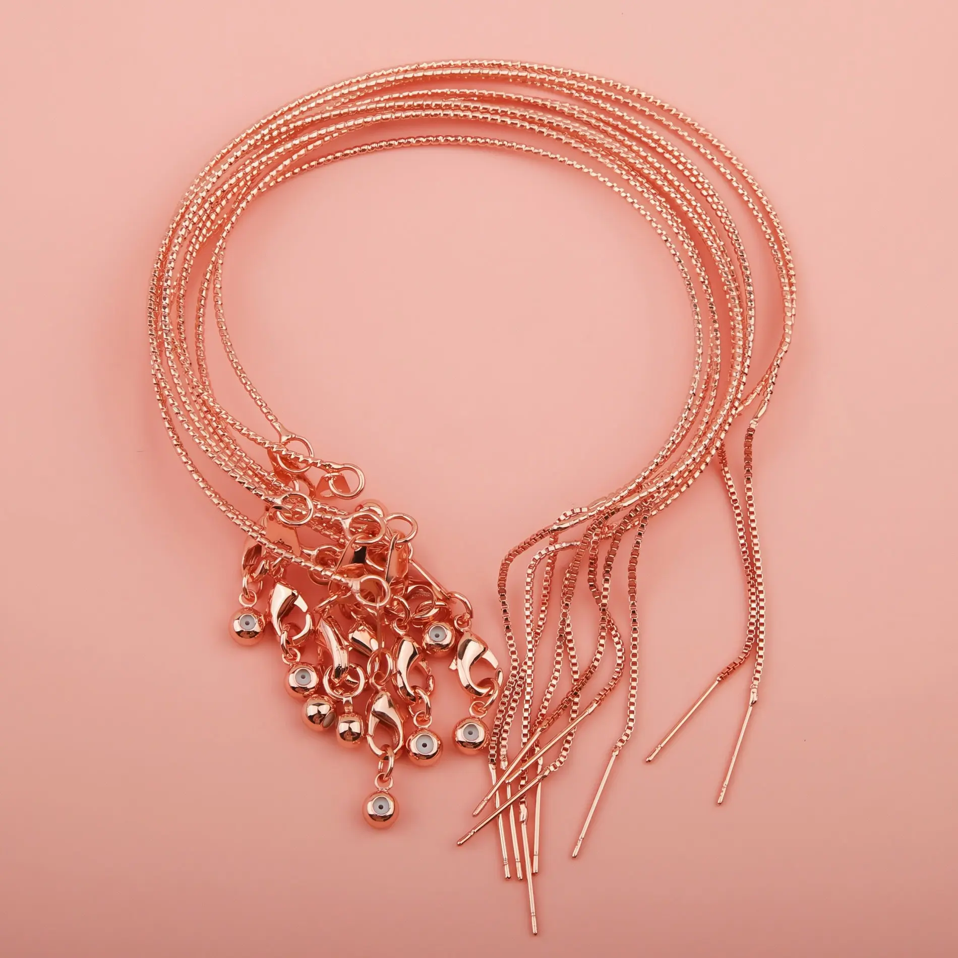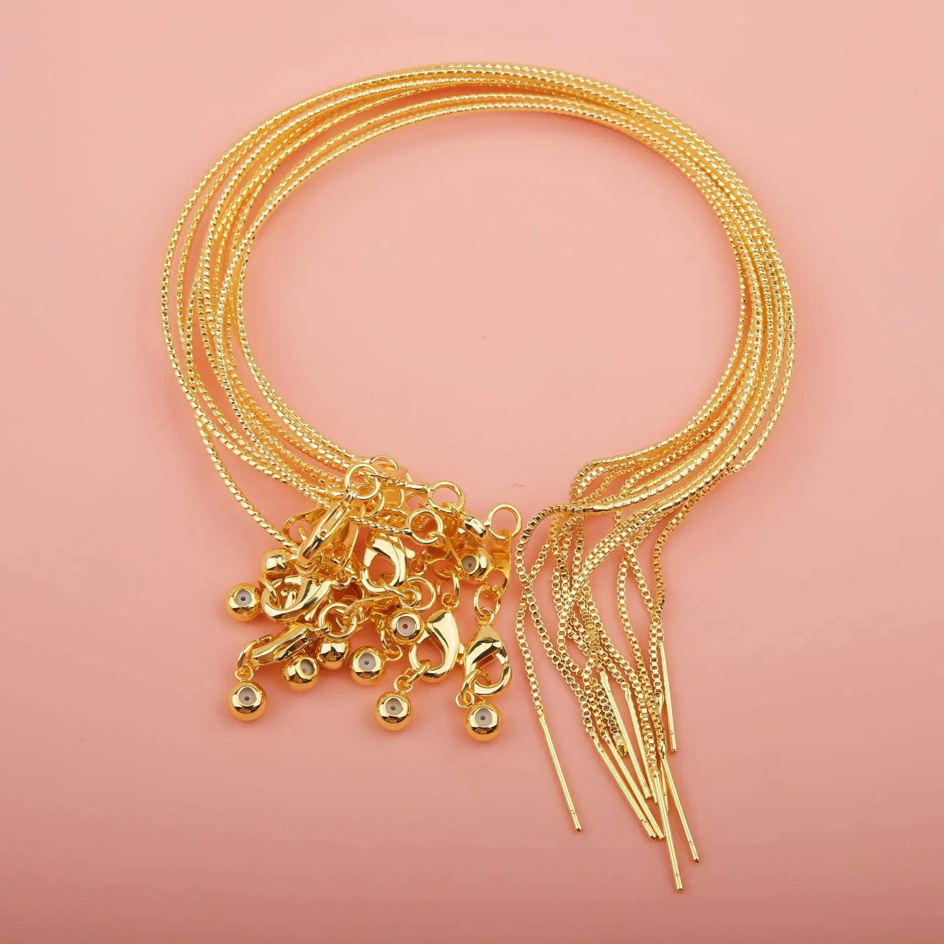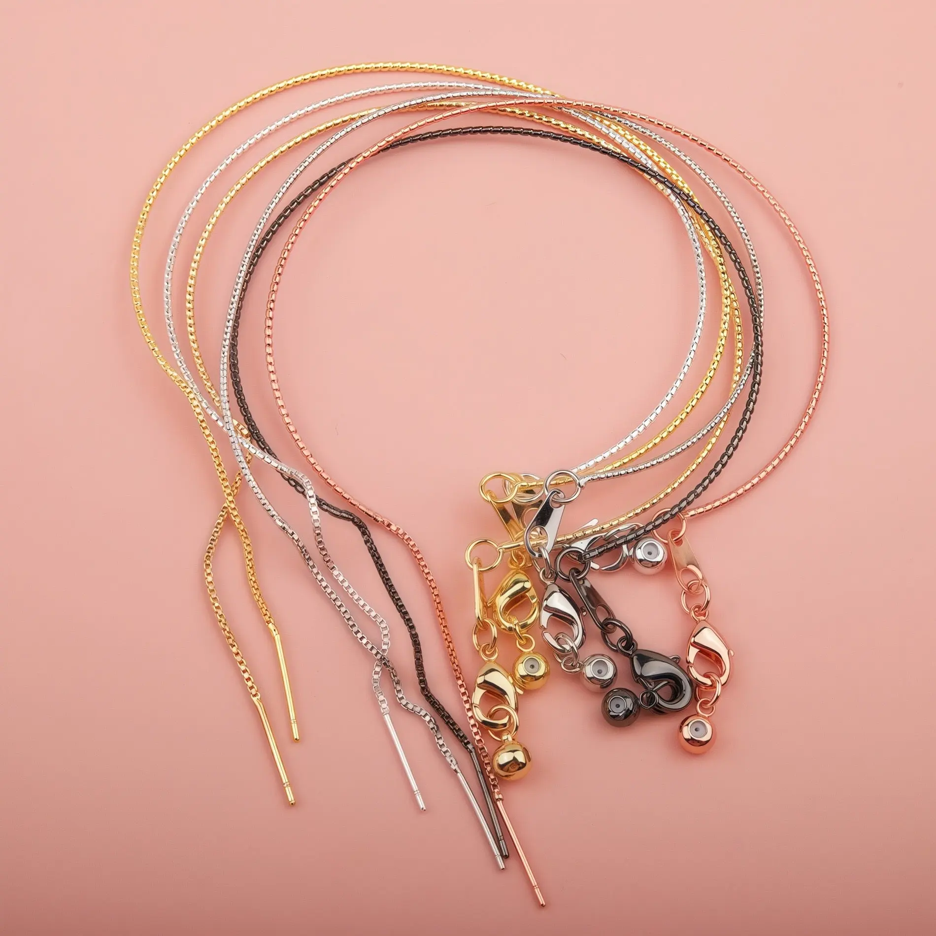 This versatile universal carved snake chain bracelet is designed for effortless DIY jewelry creation. It features a delicate, textured snake chain with fine carvings, a convenient thread-through needle end for easy bead insertion, a secure lobster clasp, and an adjustable slider bead to ensure a perfect fit for any wrist size. Available in multiple finishes—gunmetal black, rose gold, silver, gold, and a multicolor set—this bracelet combines durability, style, and flexibility, making it ideal for everyday wear, layering, or crafting personalized pieces.