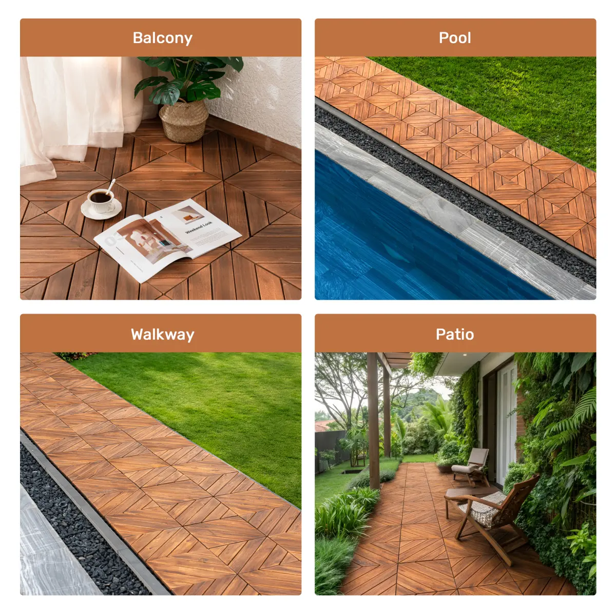 ·Multi Space Use: These interlocking outdoor deck tiles are perfect as flooring for balconies, patios, gardens, verandas, or pool areas. Suitable for outdoor patio tiles over concrete or outdoor patio tiles over grass, the modular design allows flexible installation and easy adaptation to various outdoor flooring needs.