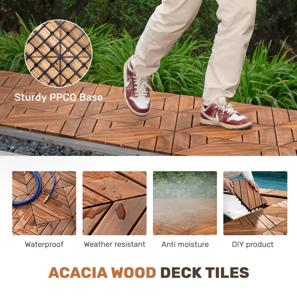 ·Natural Acacia Wood: Our click tiles are made of high-quality acacia wood with a beautiful natural grain.This robust hardwood is particularly durable and ideal for use as patio decking, outdoor tiles for patio, balcony flooring, or garden flooring in outdoor platform deck for yard spaces.