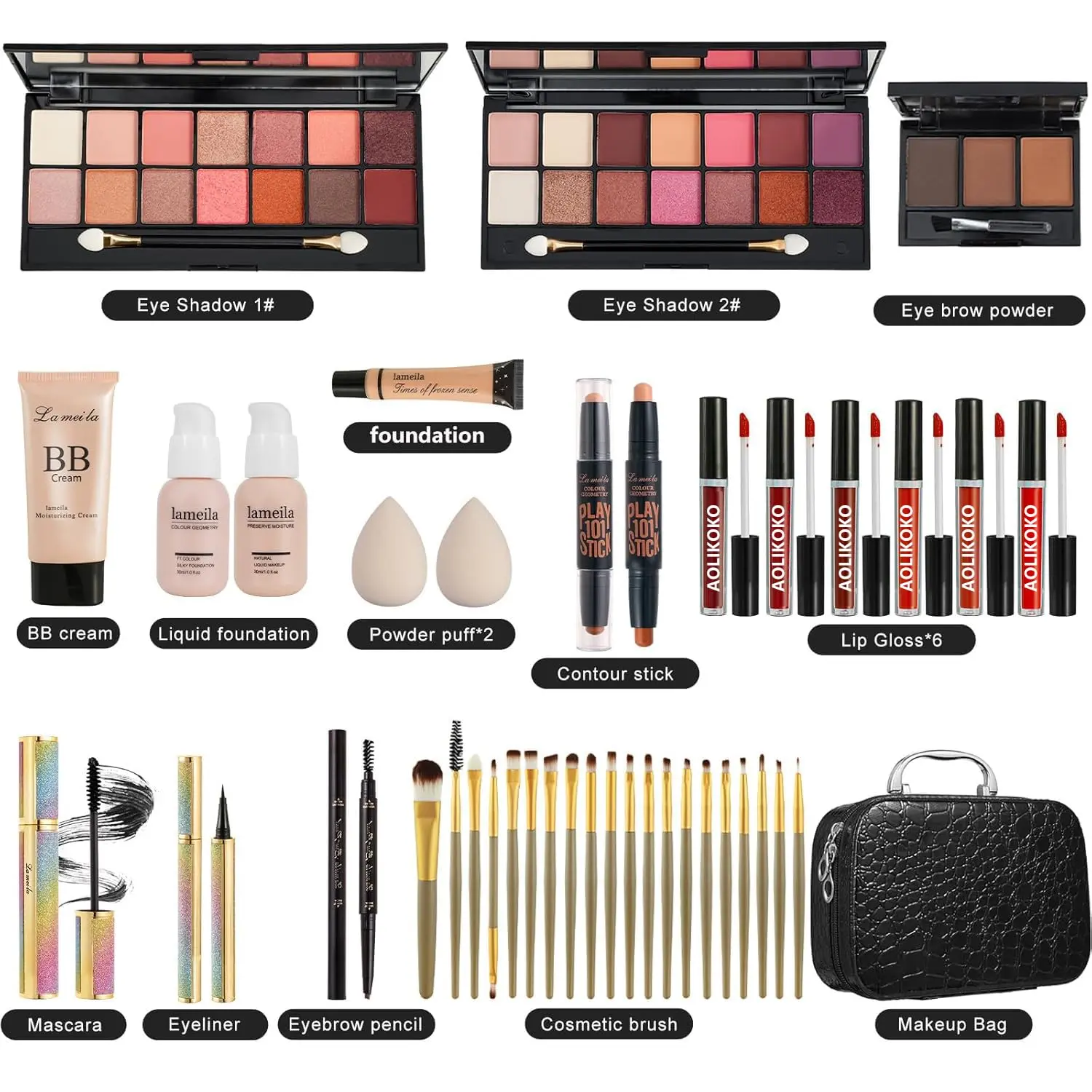 [All in One Makeup Set]This Makeup Gift Set includes everything you need for your daily makeup routine:Makeup storage bag/2x14 Color Eyeshadow Palette/Eye brow powder/BB cream/Liquid foundation/Lip Gloss/Contour stick/Mascara/Eyeliner/Eyebrow pencil/makeup brush/Powder puff,Whether you are a makeup novice or a seasoned enthusiast, this toolkit perfectly meets your daily makeup needs. [Complete cosmetics]This makeup set for women contains a complete range of cosmetics, which can easily create a variety of makeup looks, suitable for different occasions. The provided cosmetic bag can easily store these cosmetics, and it is simple and convenient to go out. [Exquisite gift]design of cosmetic case, high-grade aluminum outer box material,During the Christmas season,Valentine's Day,New Year's Day,Teacher's Day, Mother's Day and various memorable days,Your girlfriend, wife,daughter,mother or friend will be very happy to receive such a wonderful gift. This is also a favorite gift for people who love makeup. [Portable Size and Easy to Carry ]Effortlessly carry your beauty essentials wherever you go. This mini makeup kit's portability ensures you're always ready to enhance your look, whether you're on the move or need a quick touch-up. [Service] For our customers have a more enjoyable experience in our shop, we provide more comprehensive after-sales service, If you ever have questions or run into an issue, please give us a chance to address your concerns. Just send email or contact us.