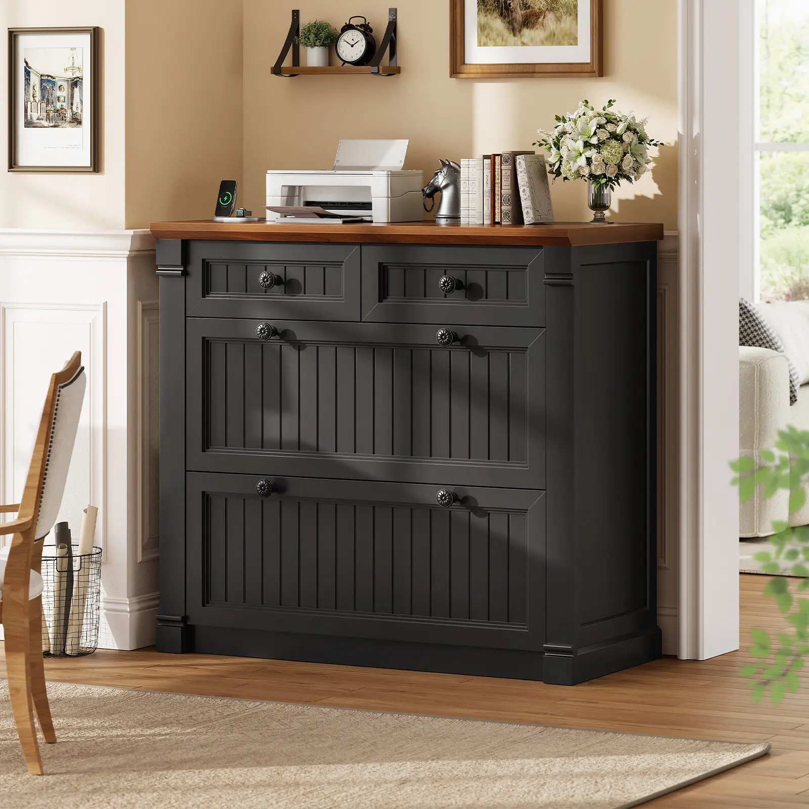 ·📁【Charging Station】The 4 drawers file cabinet is equipped with 4 sockets and 2 USB ports to power up to 6 devices at the same time. The desktop size of filing cabinets for home office is 33 inches, which is large enough to use 2 machines at the same time, means your espresso machine, printers, scanners, copiers, laptops or other office electronic devices all get VIP outlets.