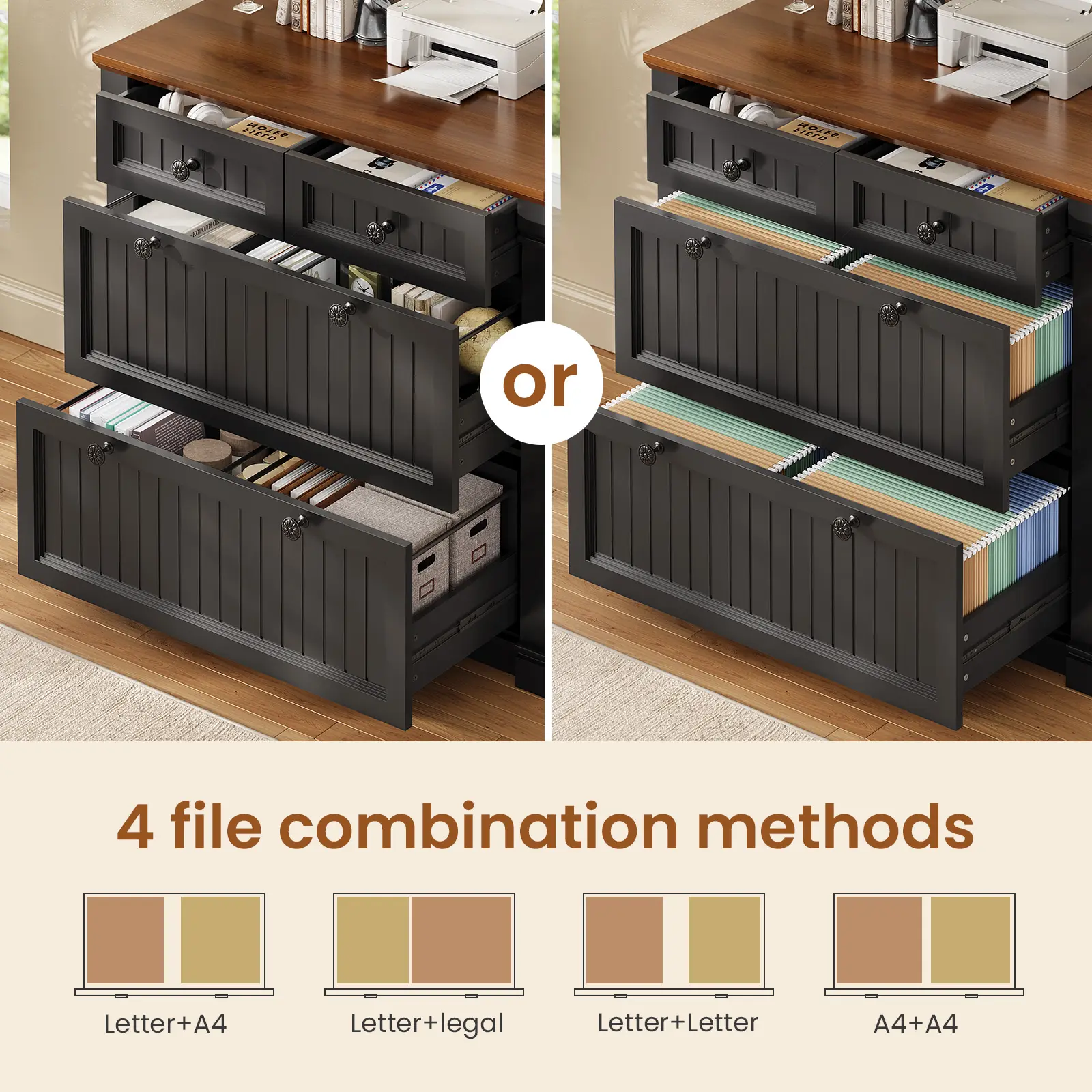 ·📁【File cabinet that doubles as your home office’s unsung hero】This filing cabinet features 2 large file drawers for hanging folders and important documents, flexible hanging rods accommodates multiple sizes file: Legal + Letter Size/ Letter+ A4 Size/ Letter + Letter Size/ A4+A4 Size. No more hassle of finding the file cabinet for different file types. Plus 2 small drawers for office supplies, sticky notes, and small gadgets.