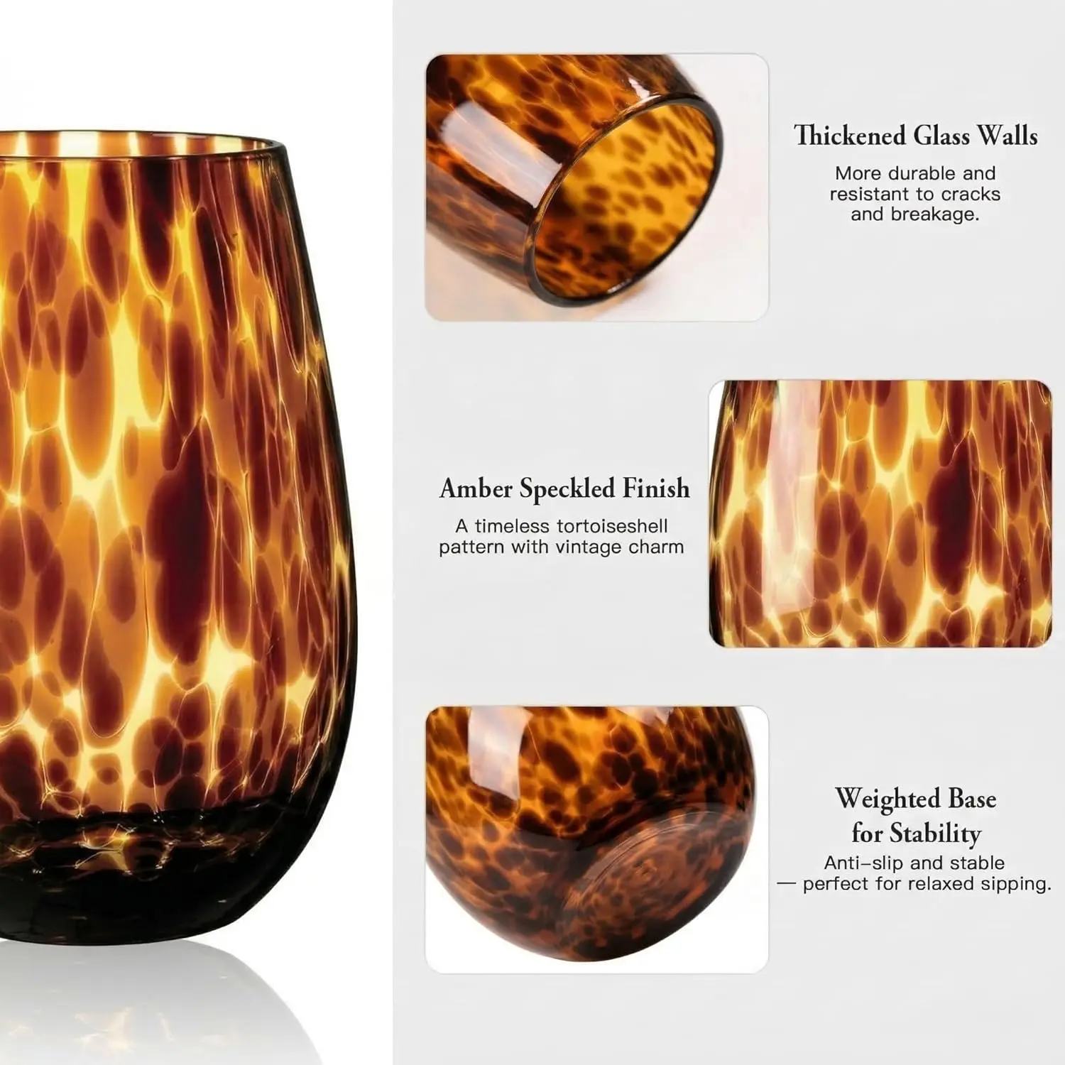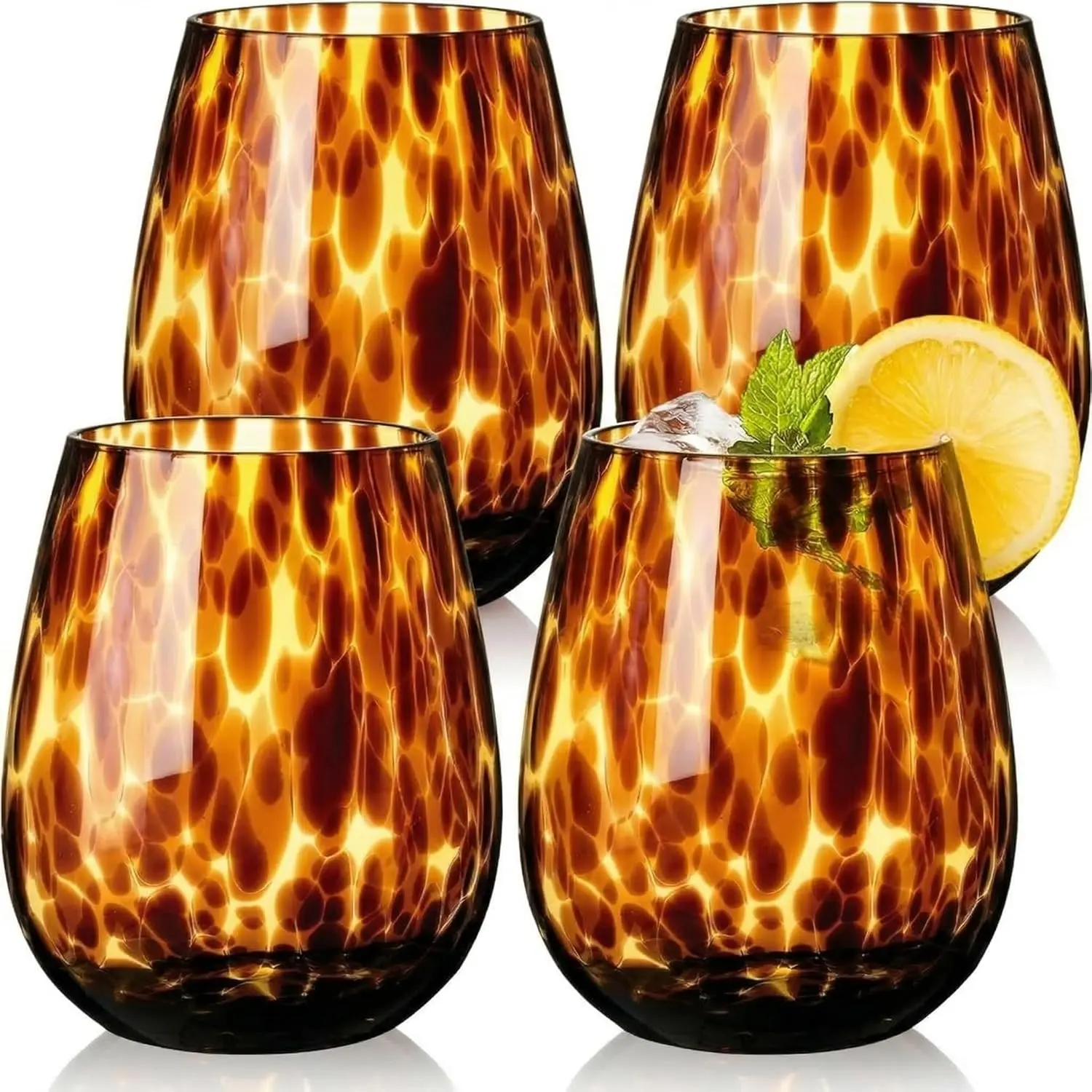 ·【Set of 4 Versatile Stemless Wine Glasses】Classic ergonomic design for easy holding. Ideal as tortoise shell glassware for home use or housewarming gifts.