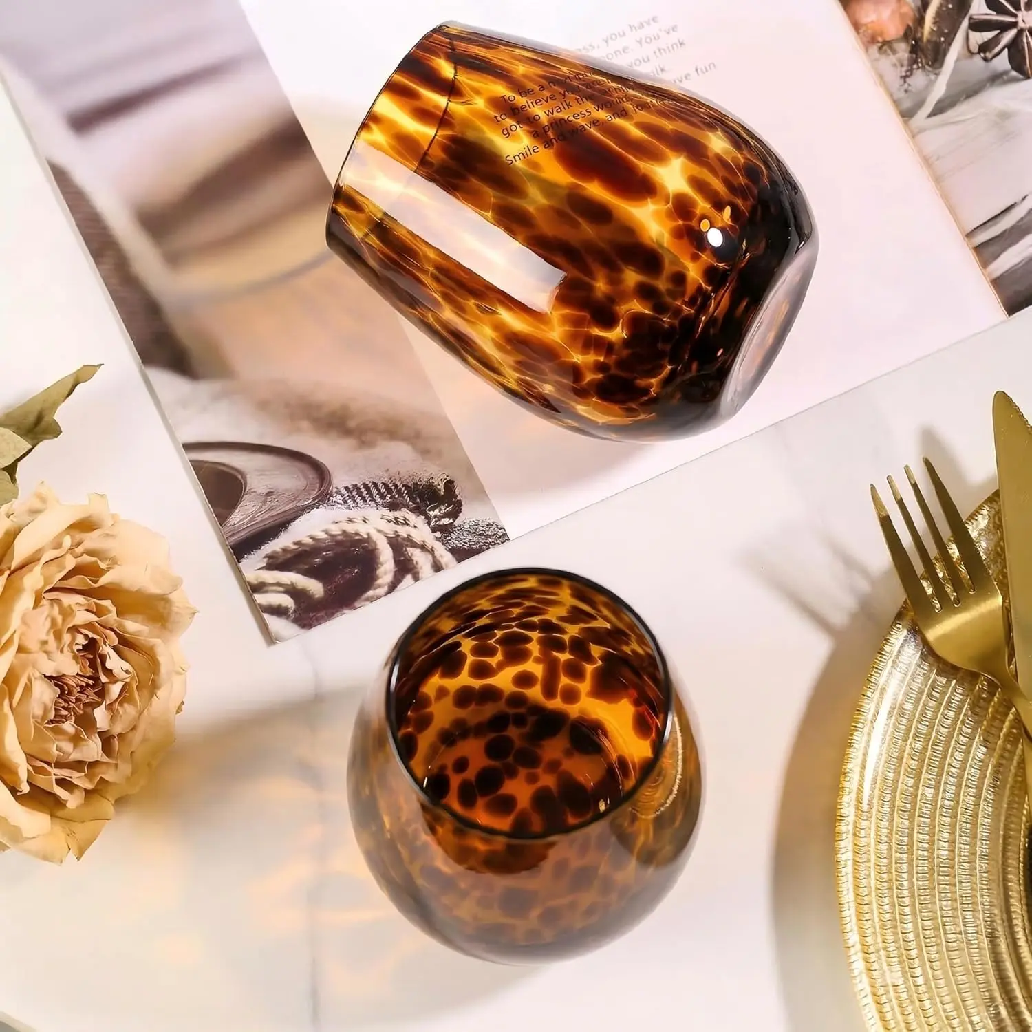 ·【Unique Brown Tortoise Shell Pattern】These brown stemless wine glasses feature elegant brown tortoise shell dotted decor, adding a retro-chic touch to your dining table, bar cart or party.