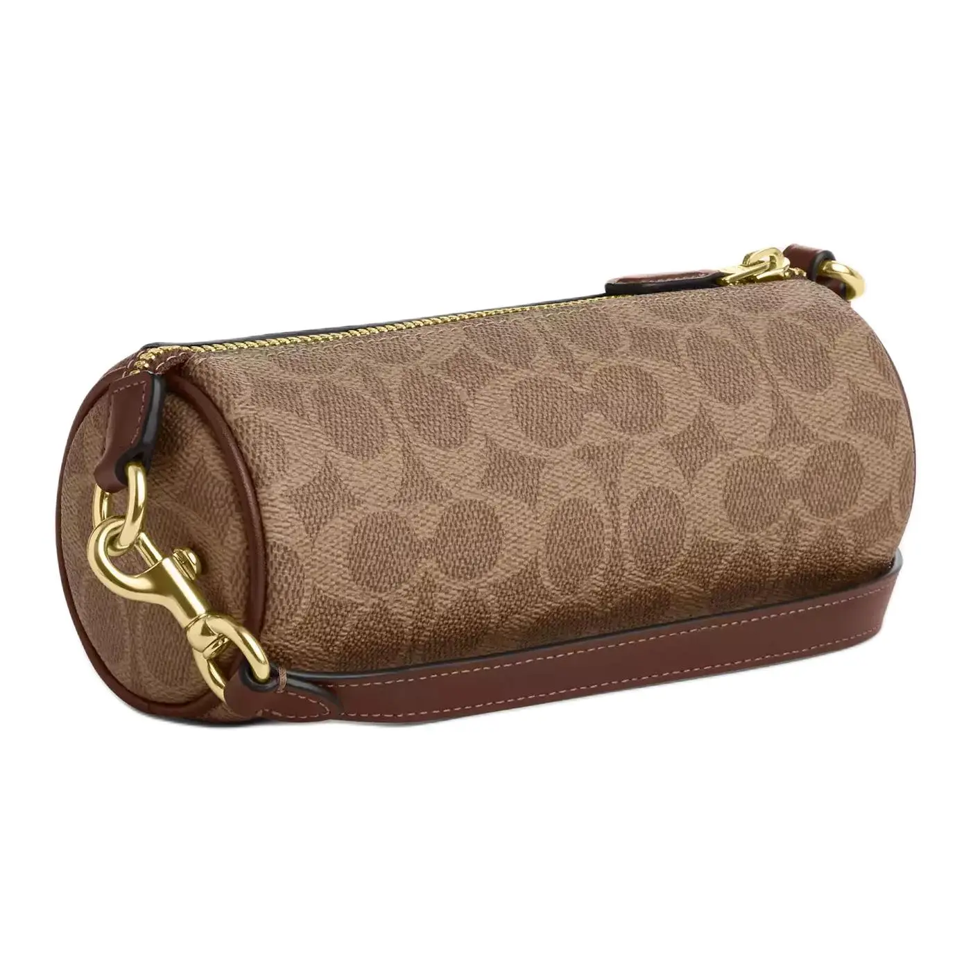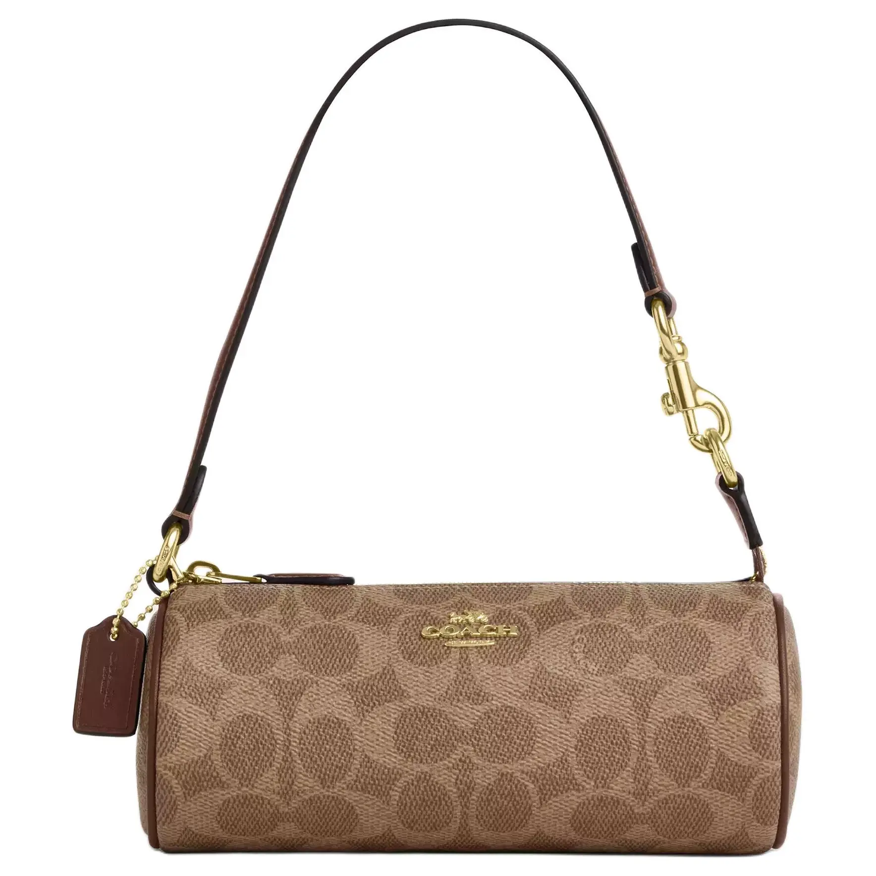 Materials: Crafted from premium caramel-colored PVC-coated canvas combined with smooth, rich full-grain leather trim. Hardware features polished antique-gold-tone metal accents. Lining is soft, durable cotton twill with COACH branding.