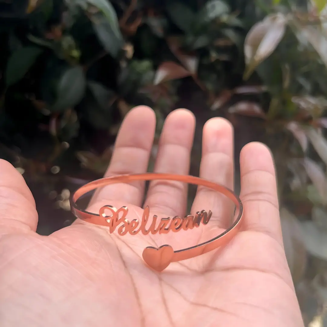 A stylish and meaningful accessory perfect for anyone proud of their Belizean roots. Crafted from high-quality stainless steel, this adjustable bangle is both durable and elegant. Featuring the word "Belizean" in an elegant script and a charming heart symbol, this piece adds a touch of love and patriotism to your outfit.