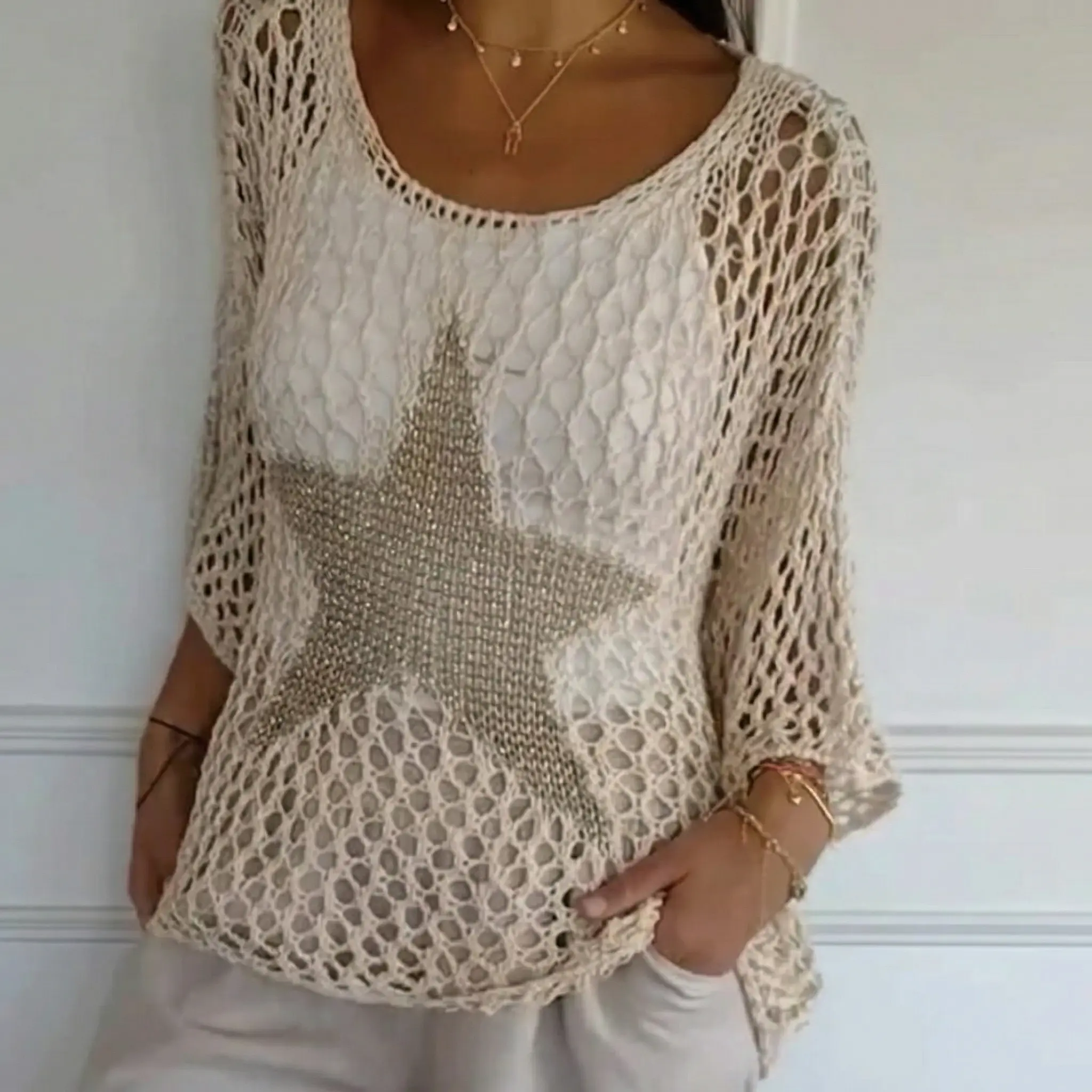 Discover the [Brand Name] Women’s Crochet Hollow-Out Star Sweater! Perfect for transitioning from the beach to the city, this lightweight pullover offers breathability and style. The bold star graphic adds a bohemian and vintage vibe. Ideal as a swimsuit cover-up or layering piece, it will turn heads.