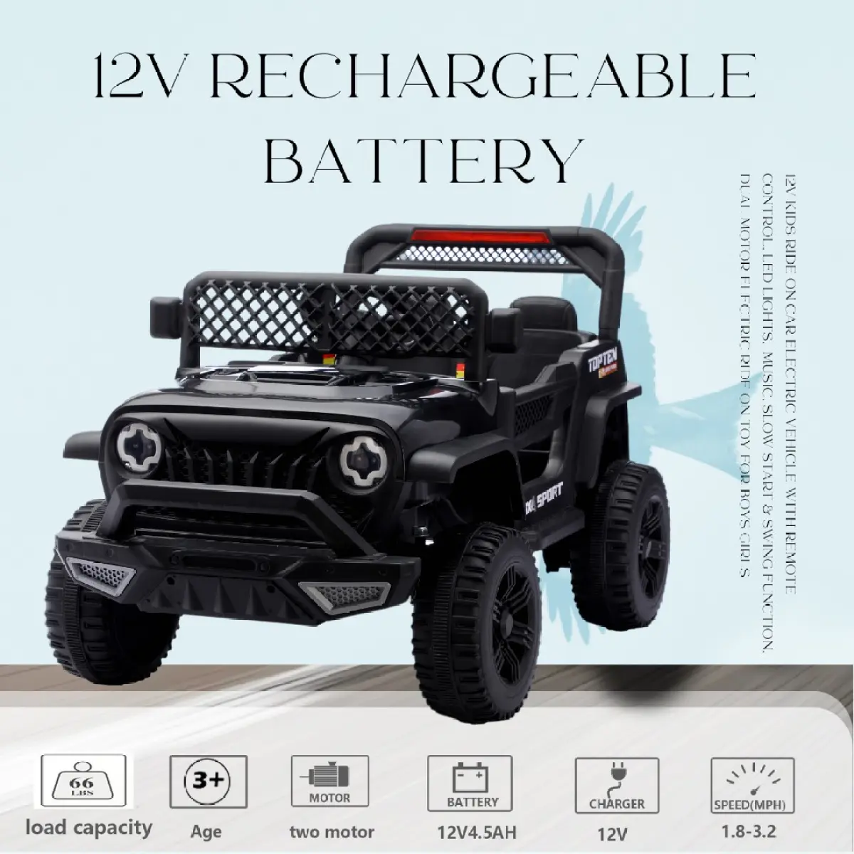 ·Jeep-Style Design & Dual MotorsDurable 12V rechargeable battery powers two strong motors, delivering smooth rides on various surfaces.Stylish jeep-inspired look with rugged tires and front grille mimics real off-road vehicles, sparking kids’ adventure spirit.